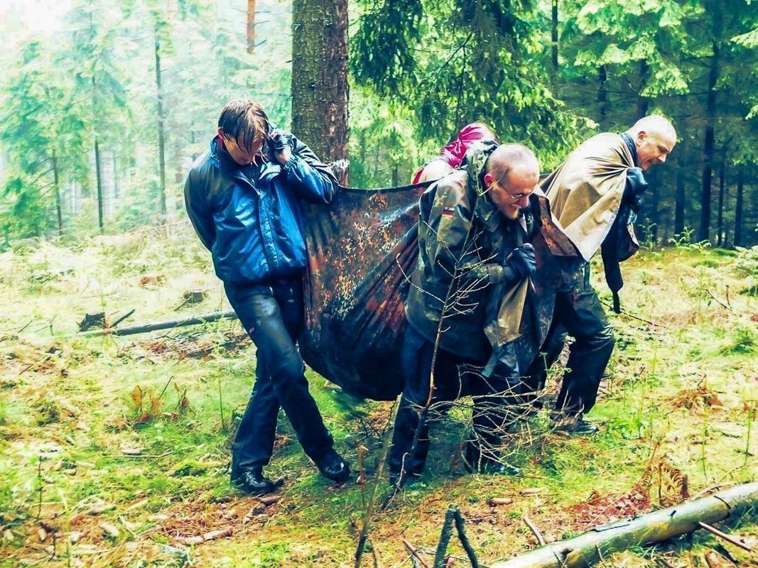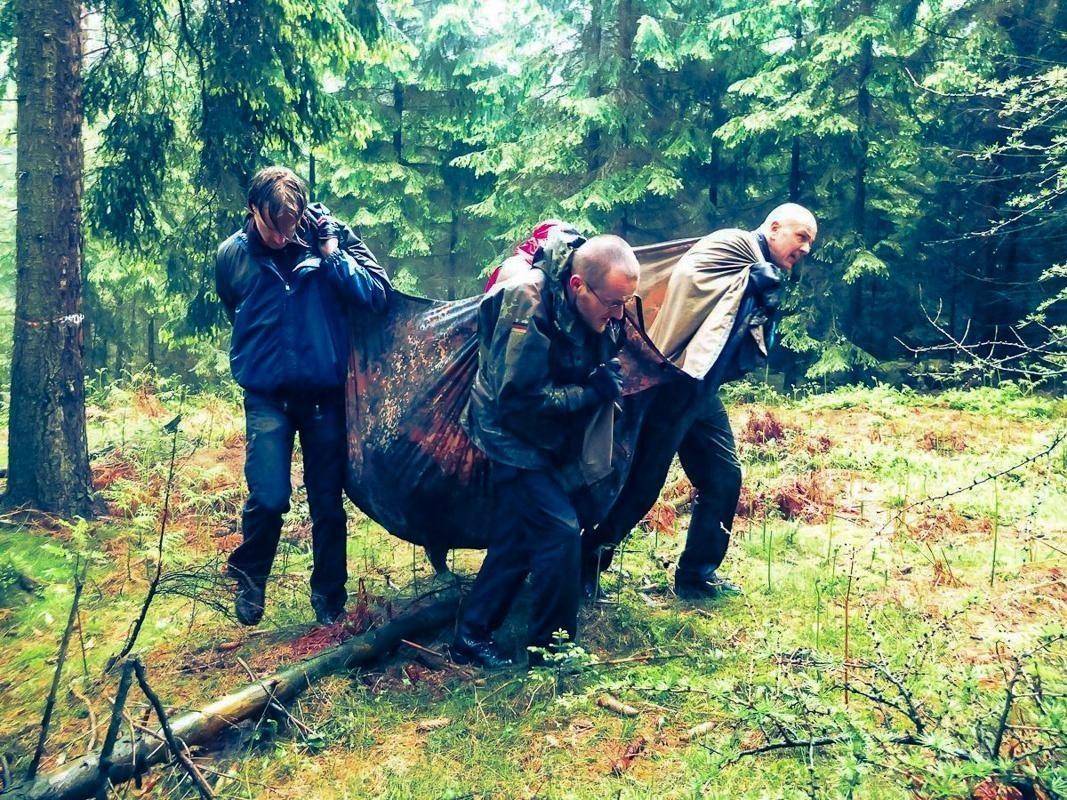 Vier Personen tragen eine improvisierte Trage durch den Wald