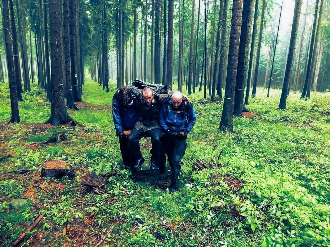 Drei Personen tragen eine improvisierte Trage durch den Wald