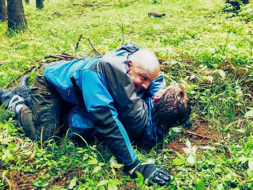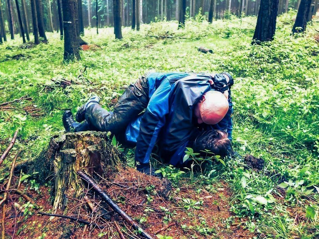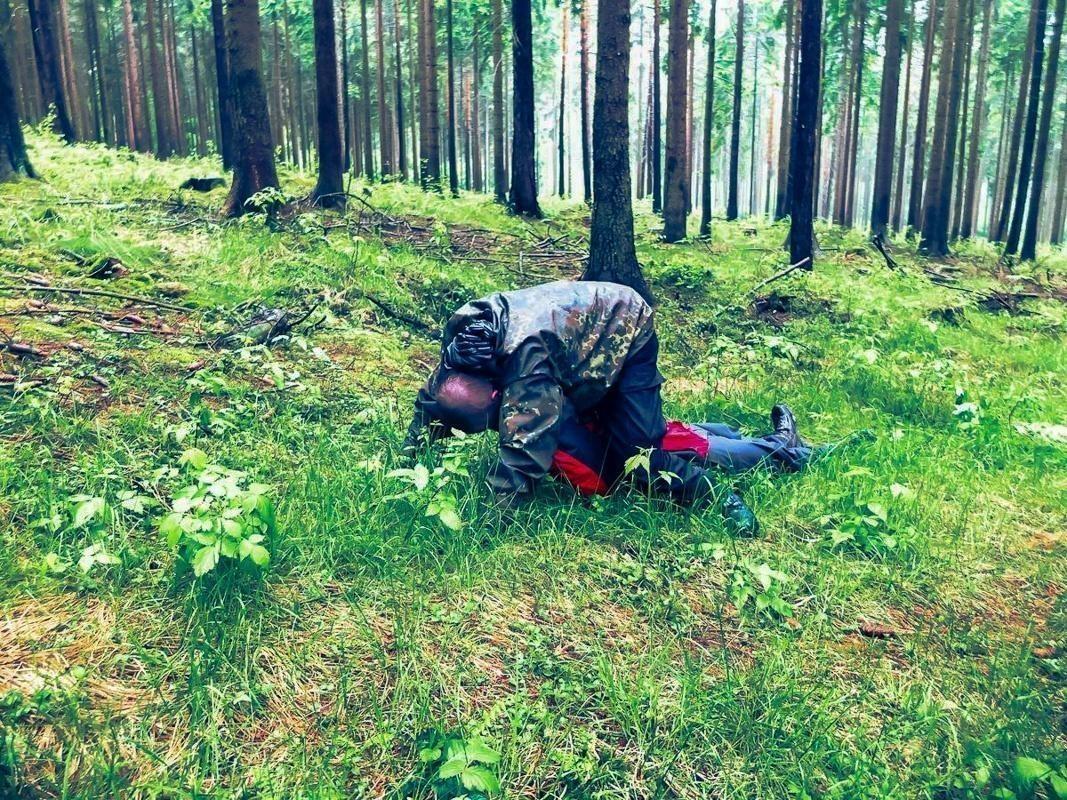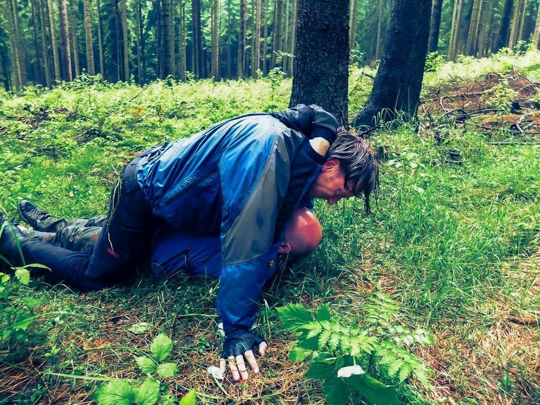 Zwei Personen liegen auf dem Boden im Wald und üben eine Technik