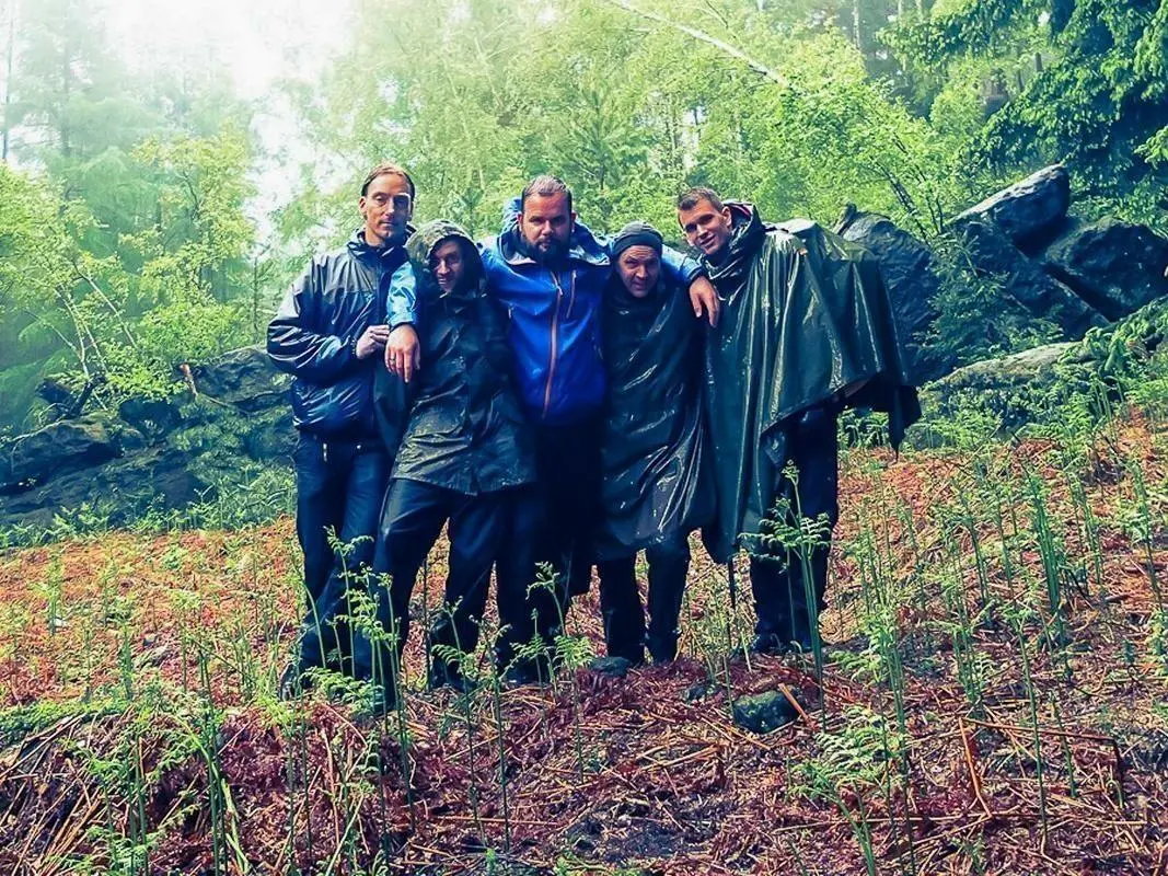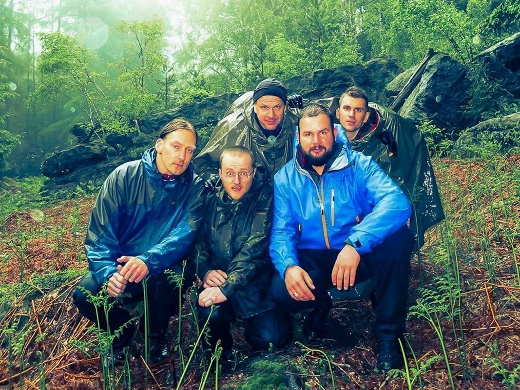 Gruppierung von fünf Personen in Regenjacken, umgeben von Wald und Felsen
