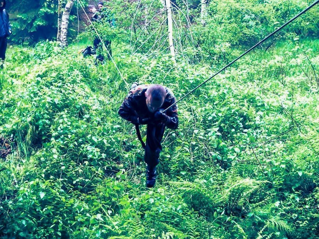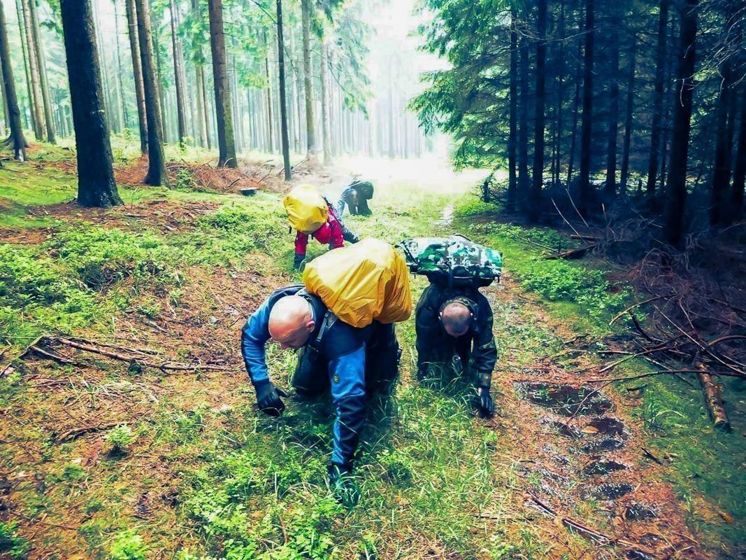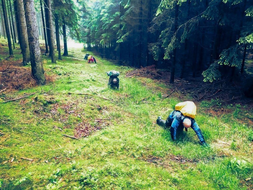 Teilnehmer kriechen durch bewaldetes Gelände mit Rucksäcken