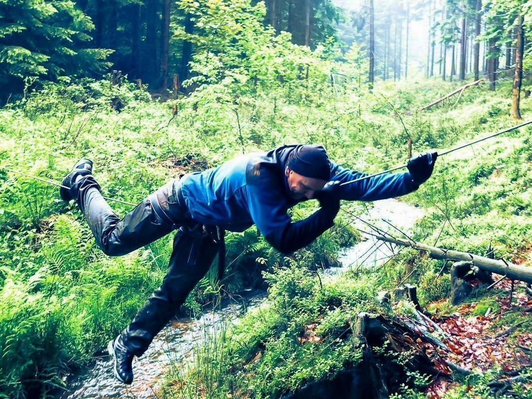 Mann überquert einen kleinen Bach mit einer selbstgebauten Seilquerung