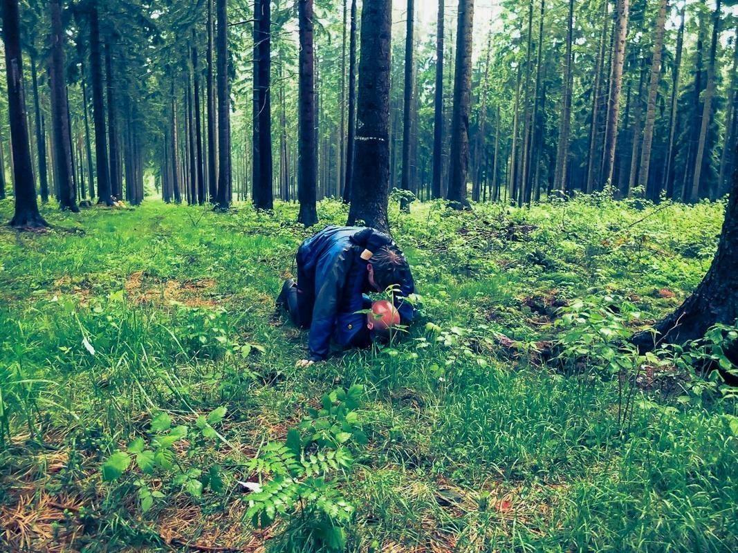 Person kriecht durch das Gras im Wald, um sich zu orientieren