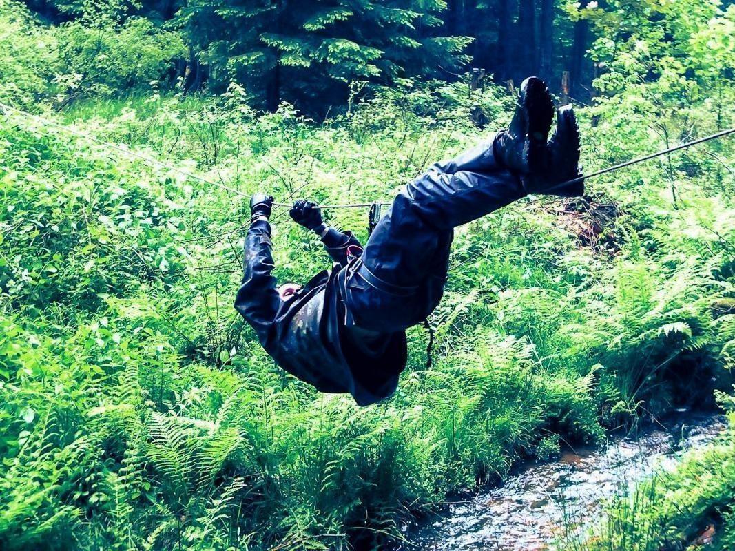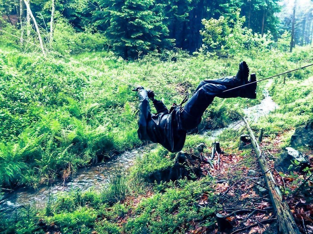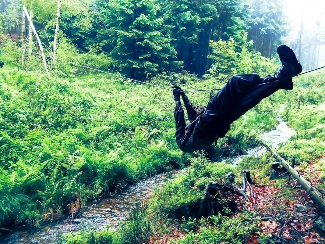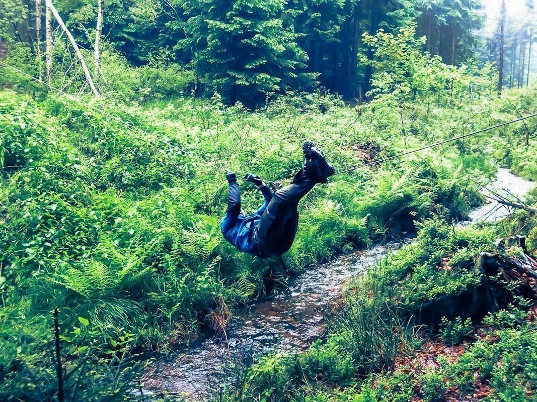 Selbstgebaute Seilquerung über einen kleinen Bach mit einer Person in Sicherheitsausrüstung