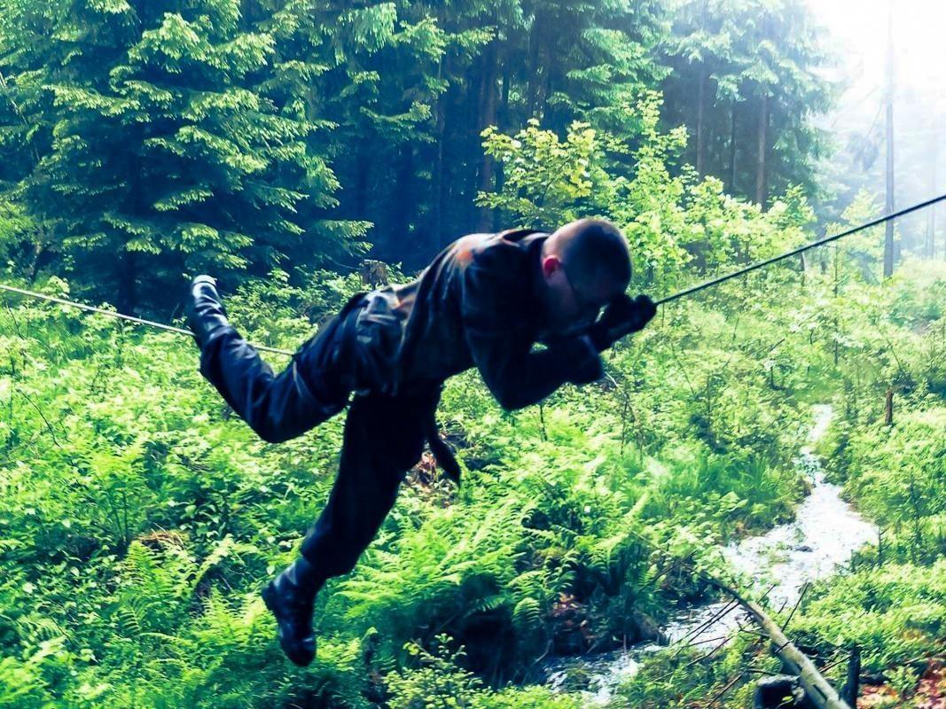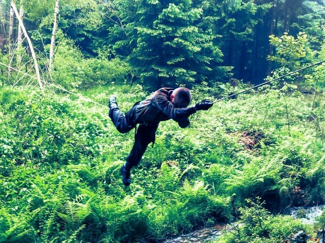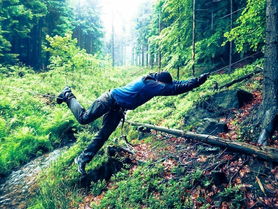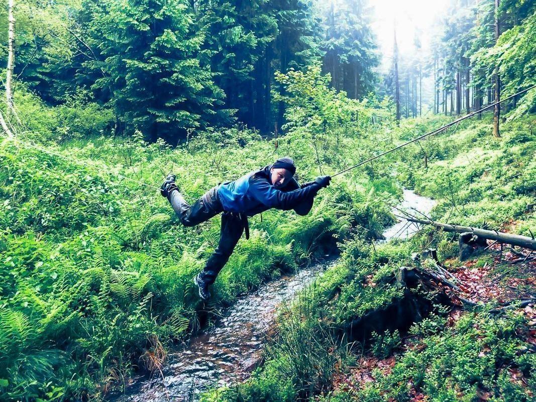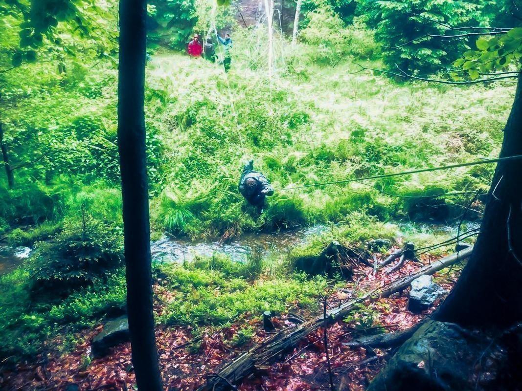 Seilquerung über einen kleinen Bach im Wald