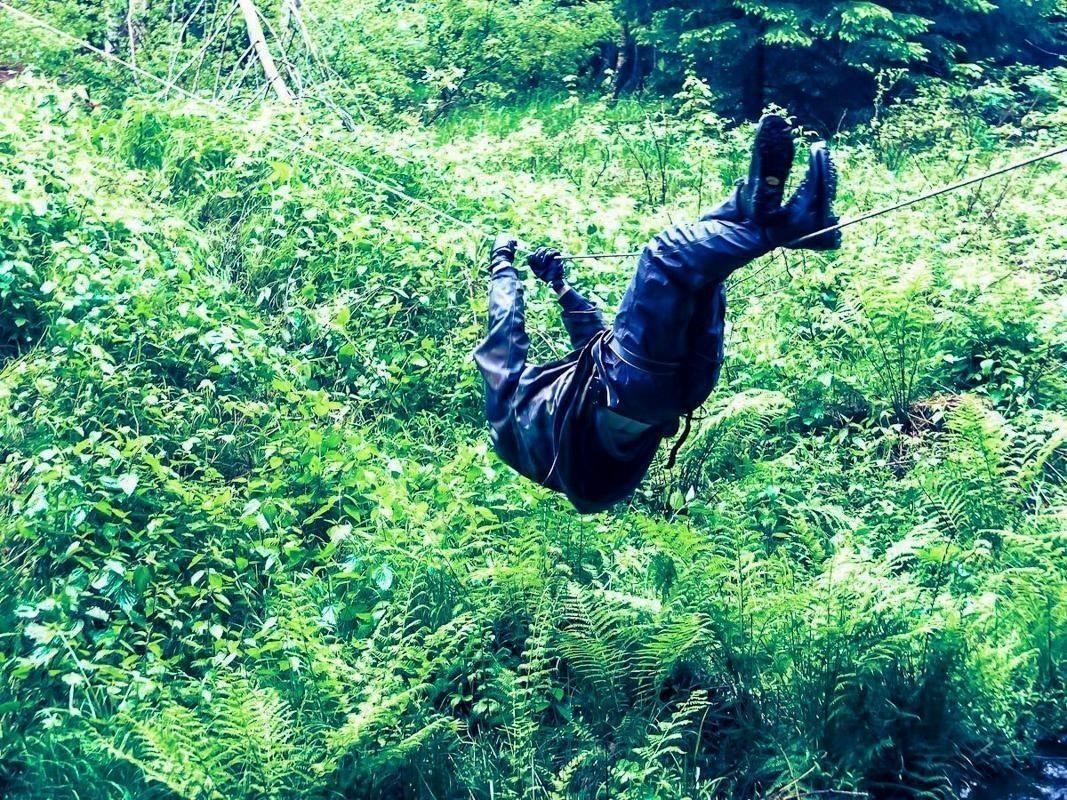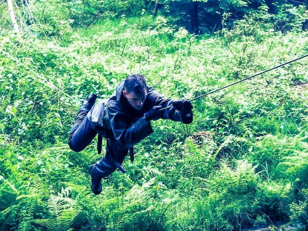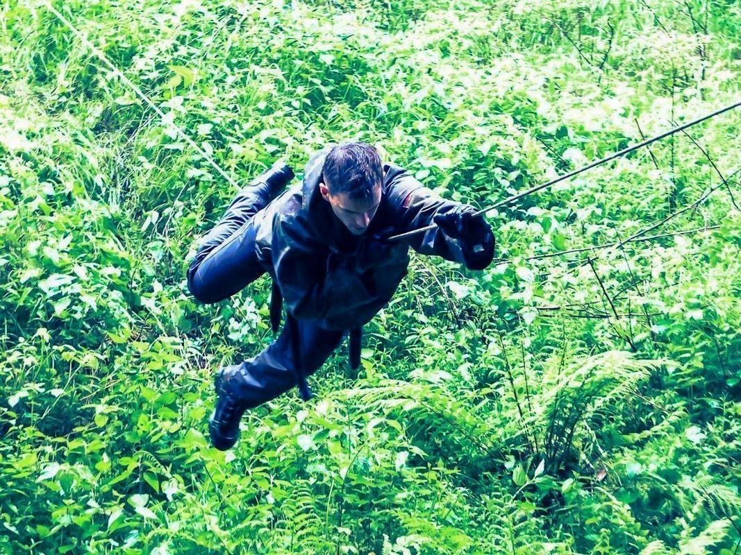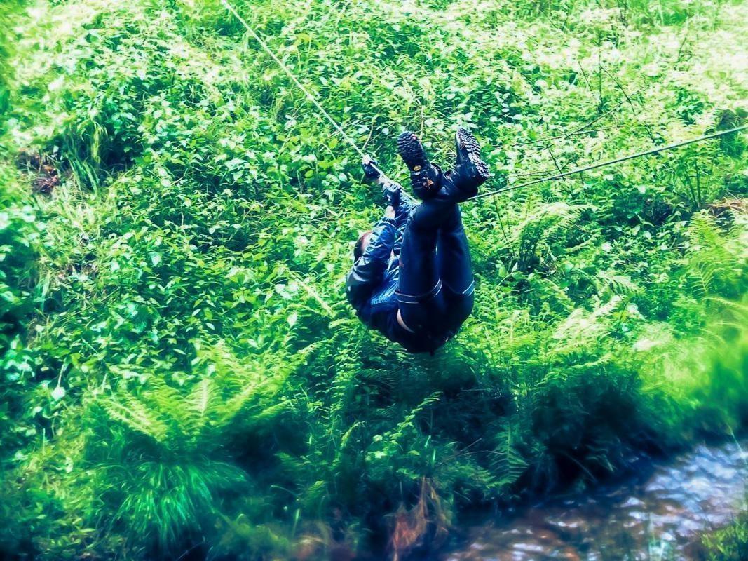 Seilquerung über eine grüne Unterholzfläche mit Farnen