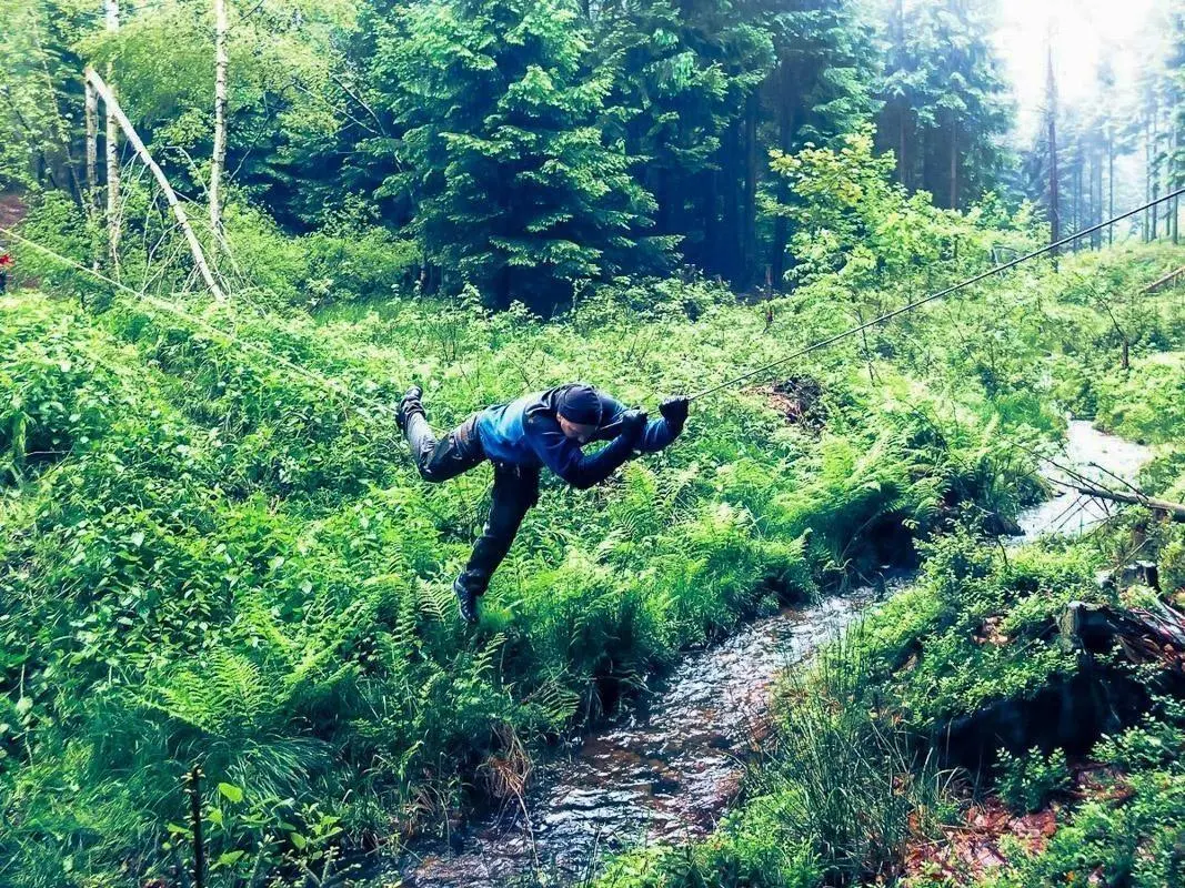 Person überquert einen kleinen Bach an einer selbstgebauten Seilquerung
