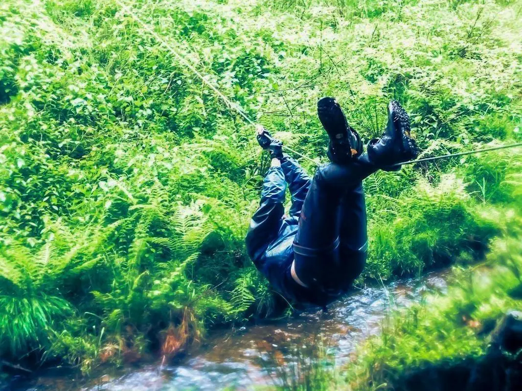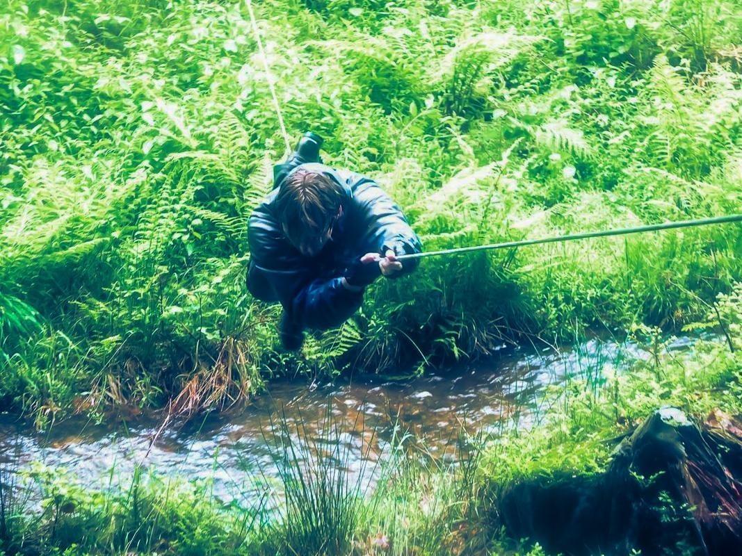Seilquerung über einen kleinen Bach mit Gras und Farn im Hintergrund