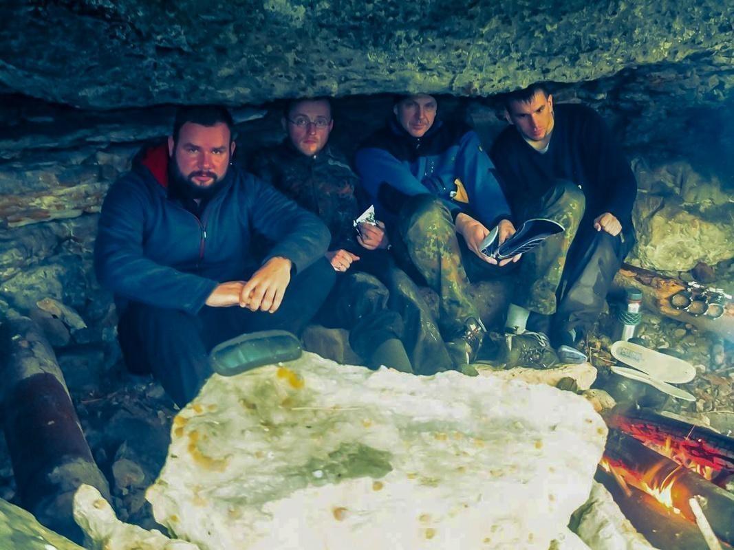 Vier Personen sitzen unter einem Felsvorsprung, ein kleines Feuer brennt vor ihnen