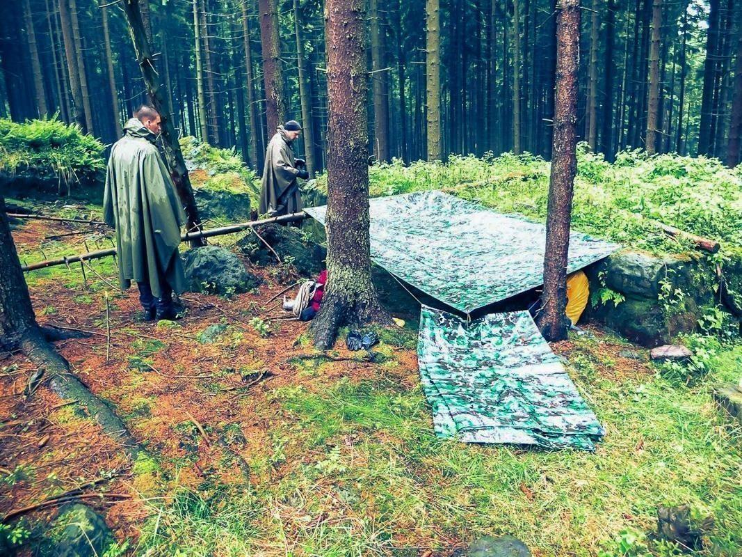 Zwei Personen bauen eine Tarp-Notunterkunft zwischen Bäumen im Wald auf