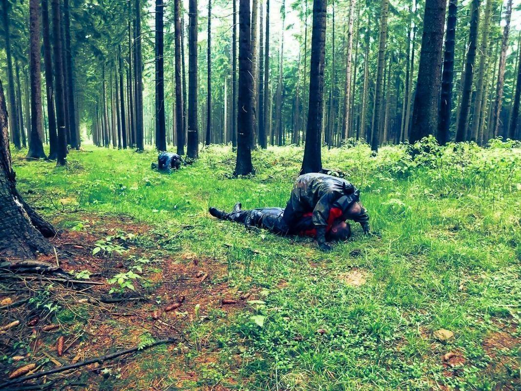 Teilnehmer kriechen auf dem Waldboden zwischen Bäumen und Moos