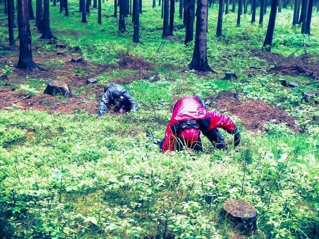 Zwei Personen suchen am Boden im Wald nach essbaren Pflanzen
