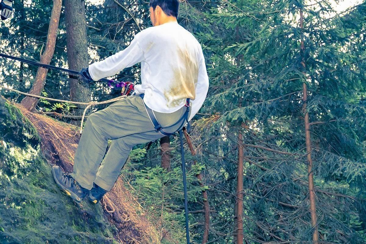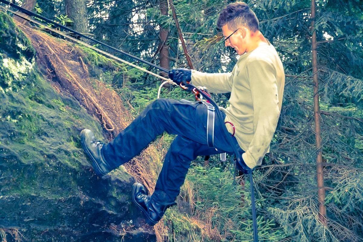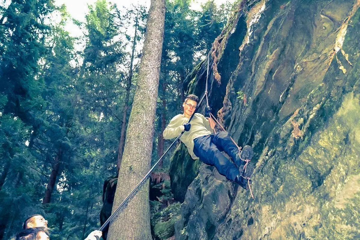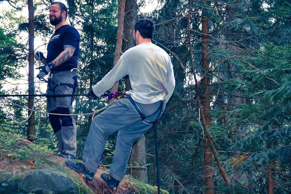 Mann überquert mit Seil eine Felsformation in einem bewaldeten Gebiet