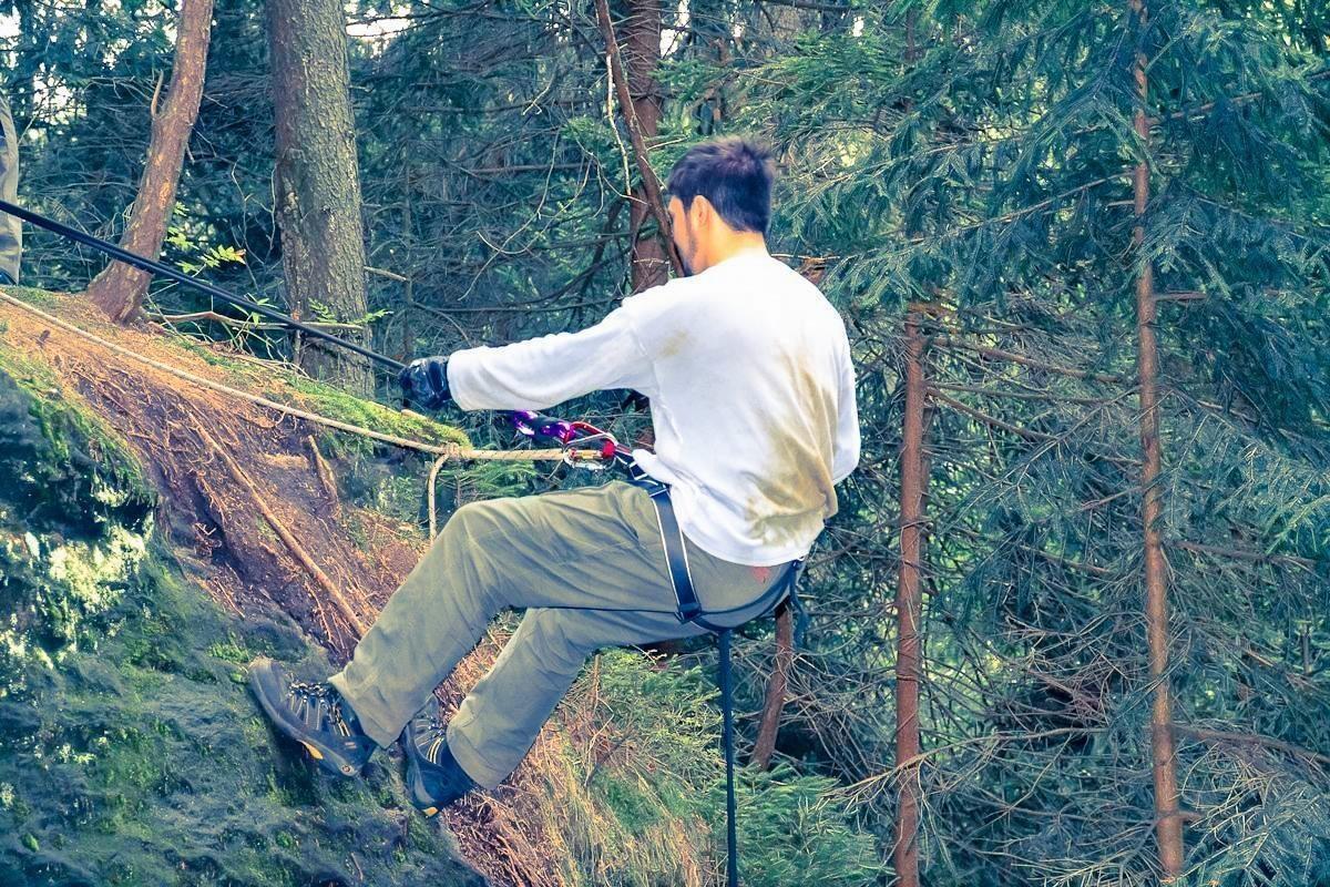 Abseilen an einem steilen Hang mit Seil und Karabiner