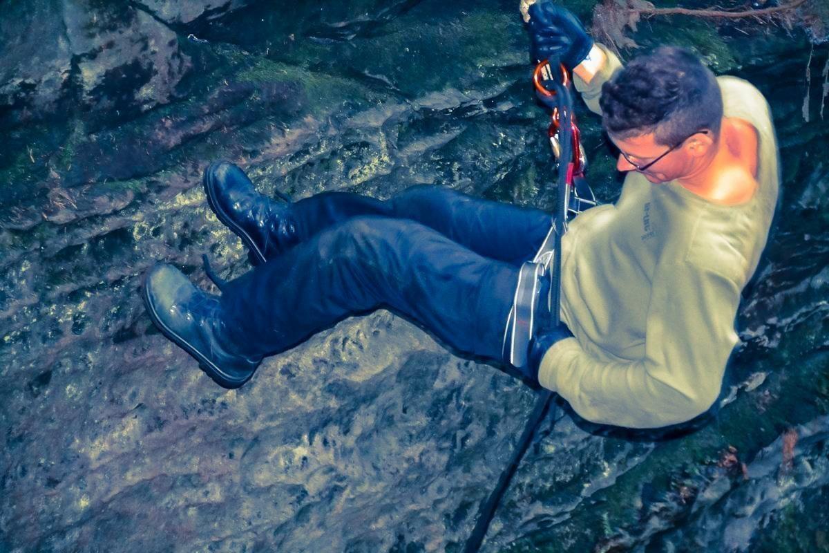 Abseilen an einer Felswand mit Sicherungsseil und Karabiner