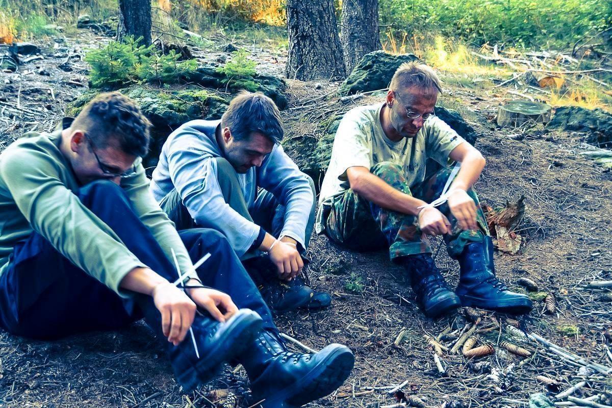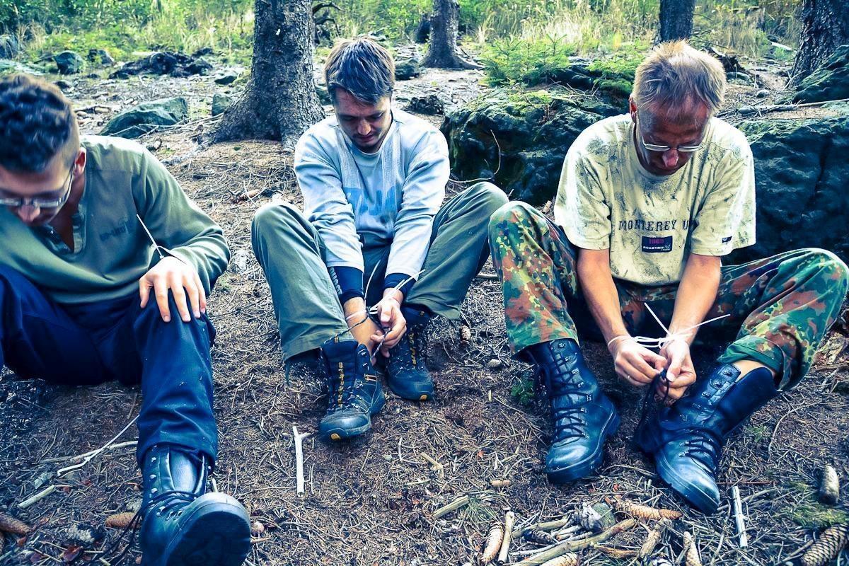 Drei Personen sitzen im Wald und binden ihre Stiefel