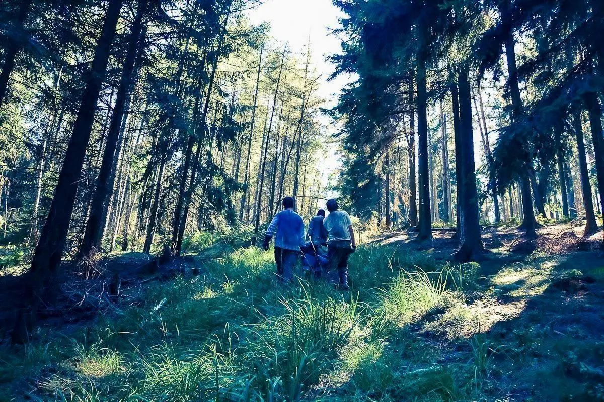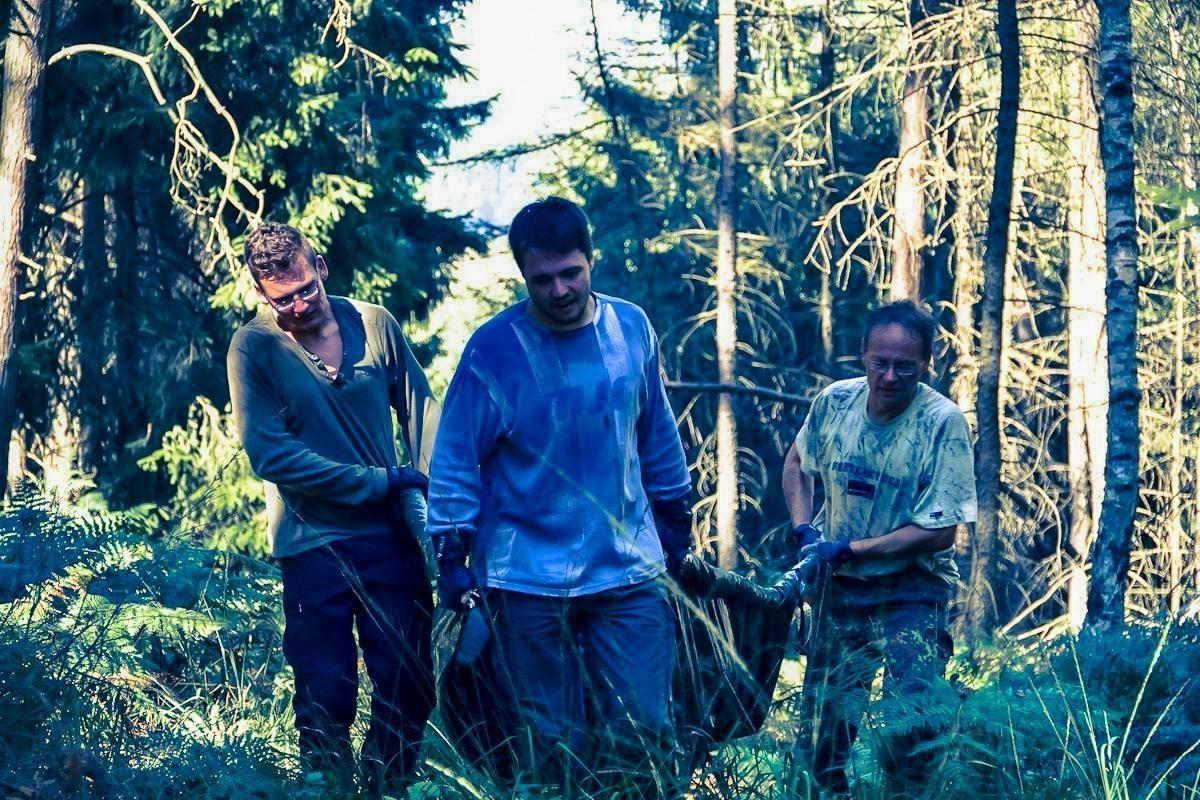Drei Personen tragen eine große Tasche durch einen Wald mit hohen Bäumen