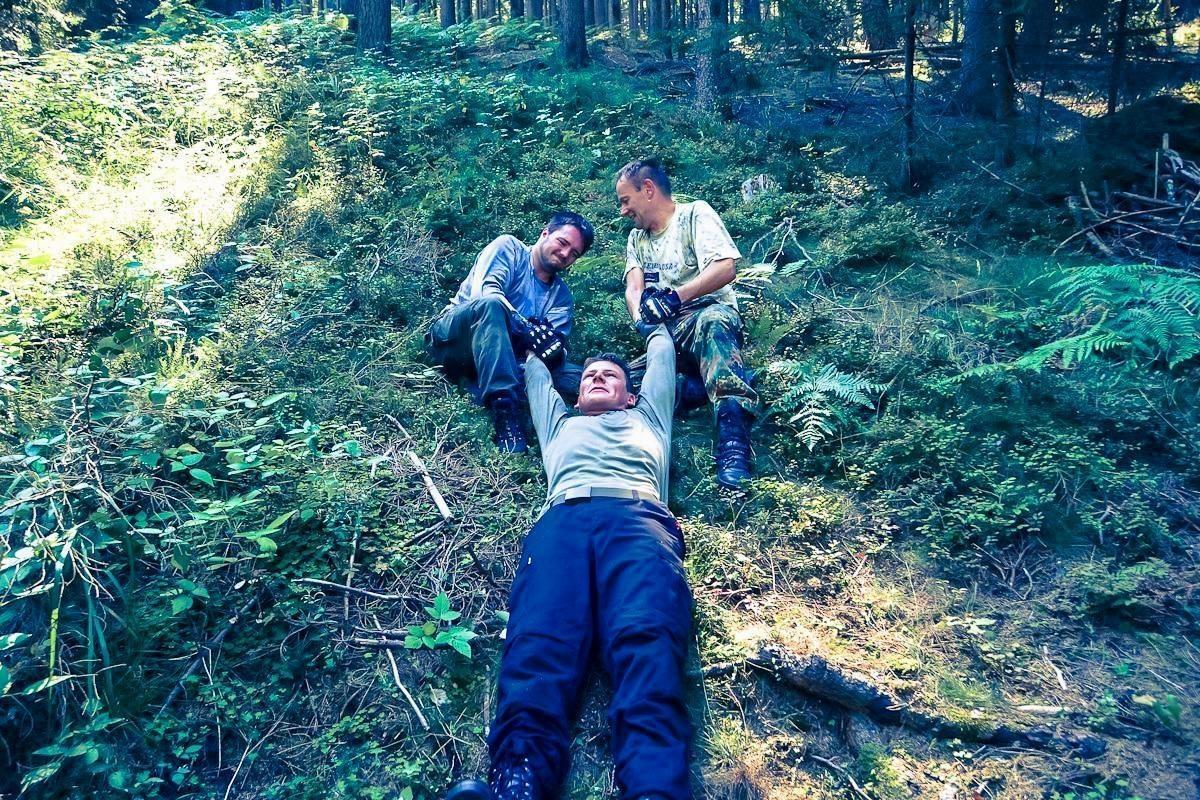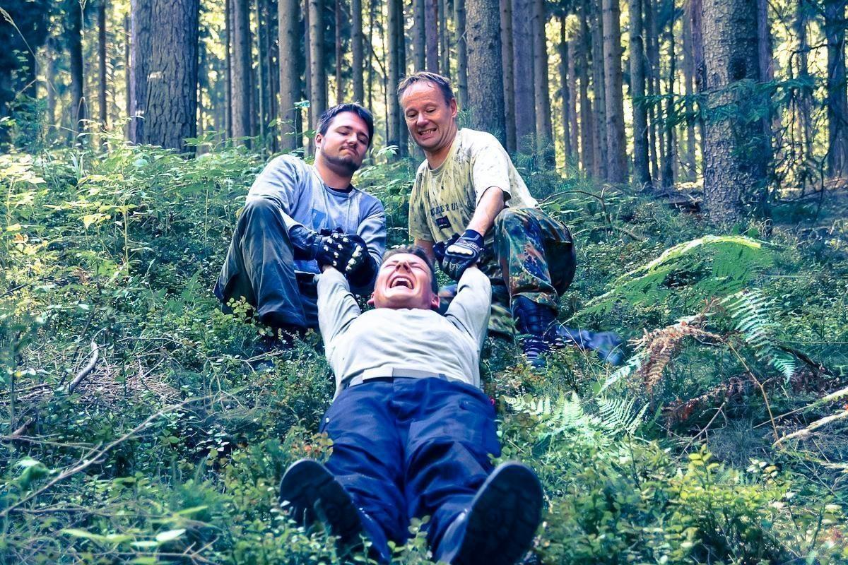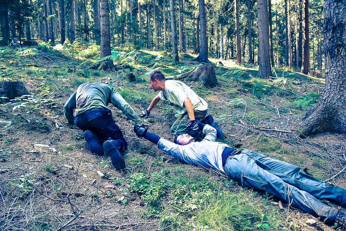 Drei Personen helfen einem Verletzten auf dem Waldboden