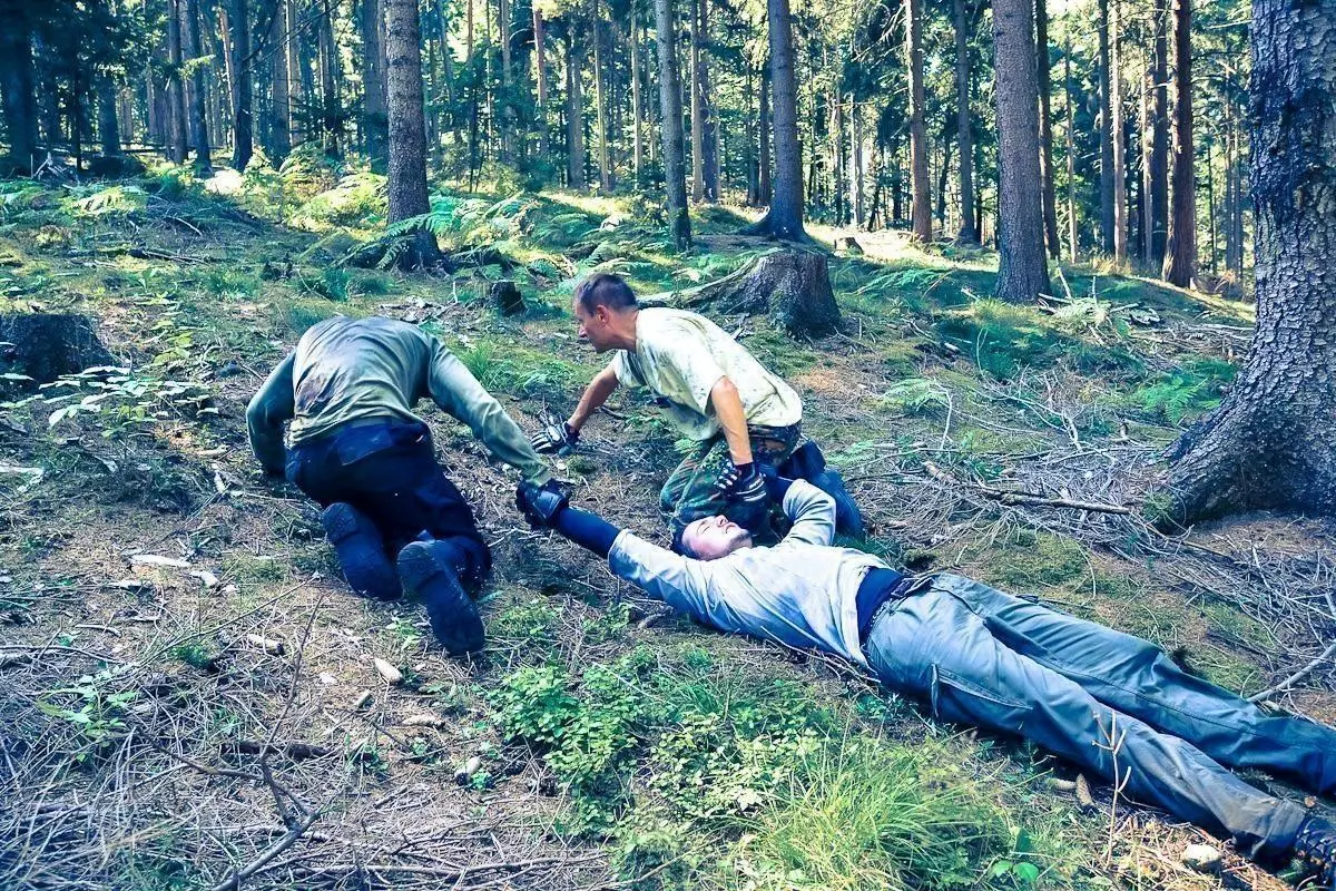 Drei Personen helfen einem Verletzten im Wald, einer stützt den Kopf