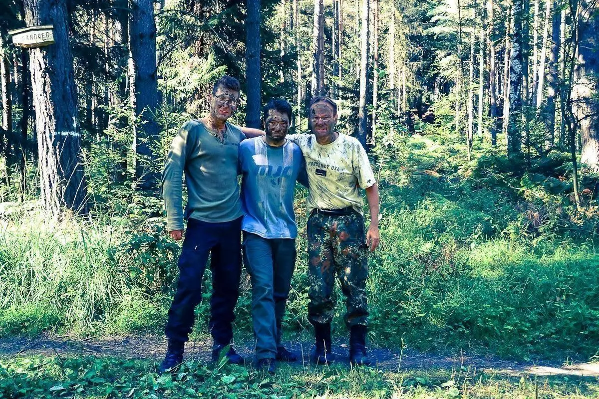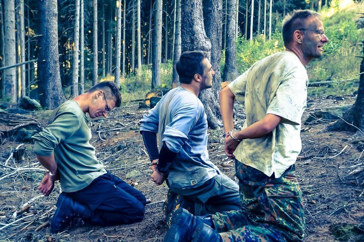 Drei Personen stehen im Wald, mit Schmutz im Gesicht und militärischer Kleidung