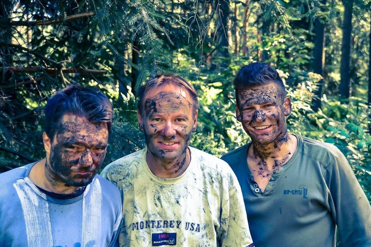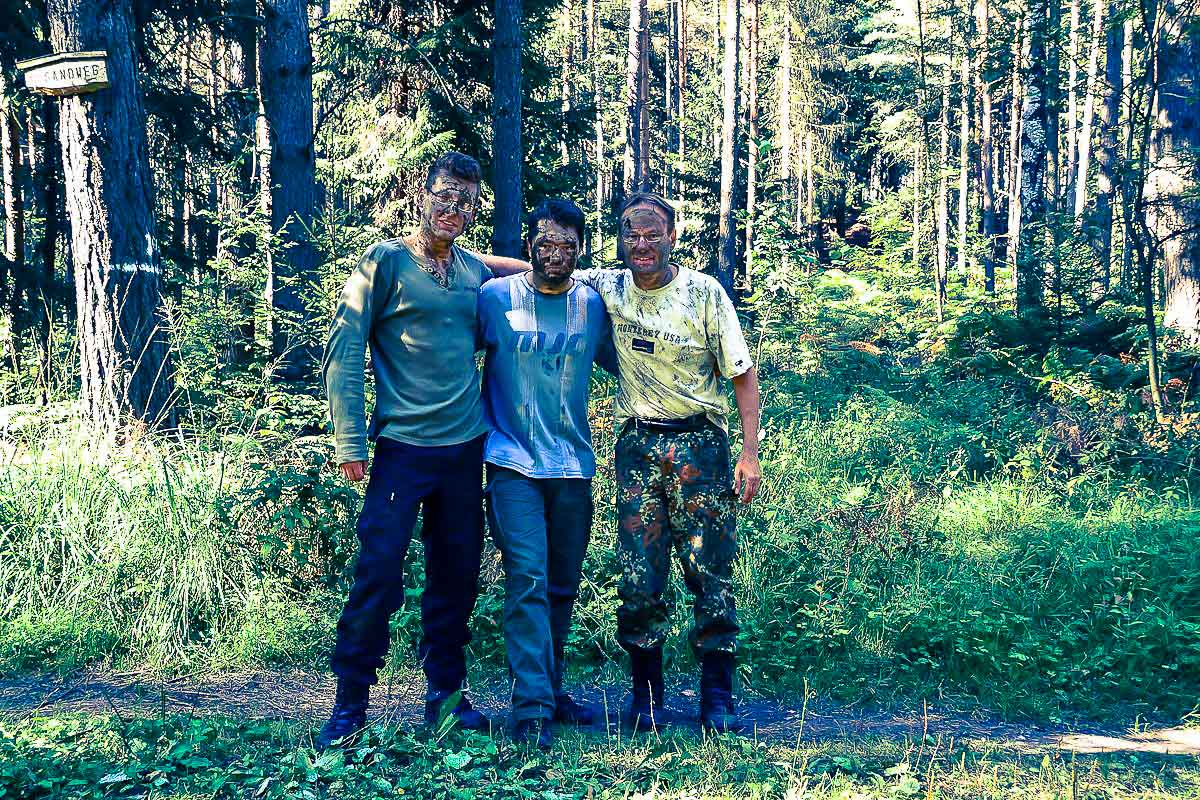 Drei Personen mit verschmutzten Gesichtern stehen im Wald