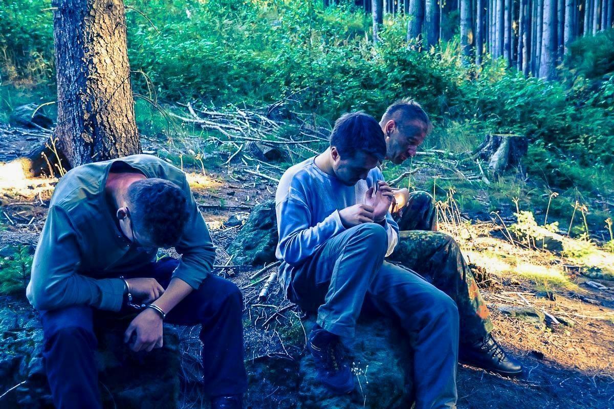 Drei Personen sitzen auf Steinen im Wald, Hände gefesselt, mit gesenkten Köpfen
