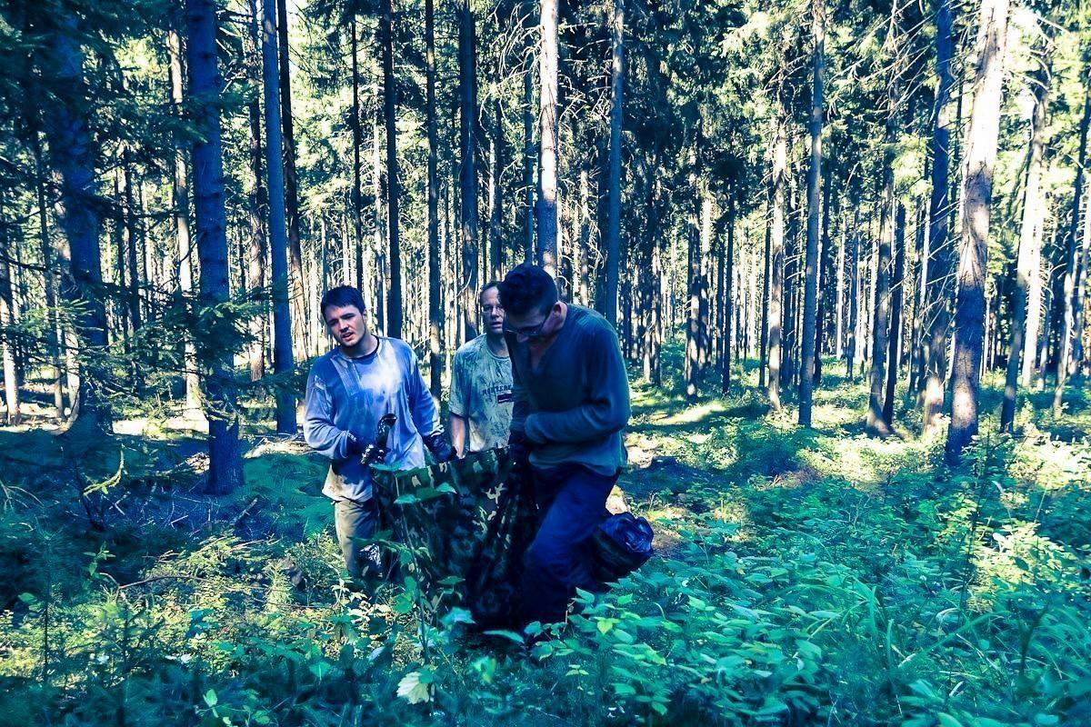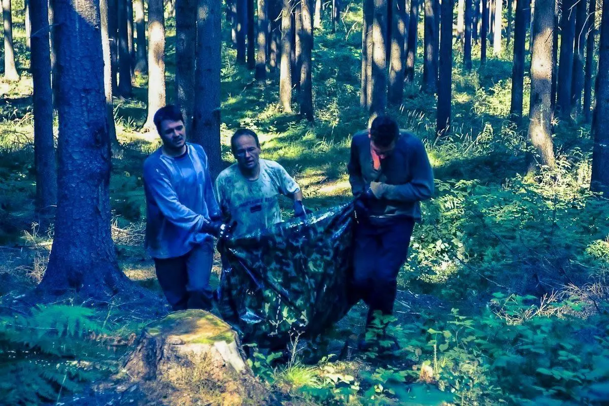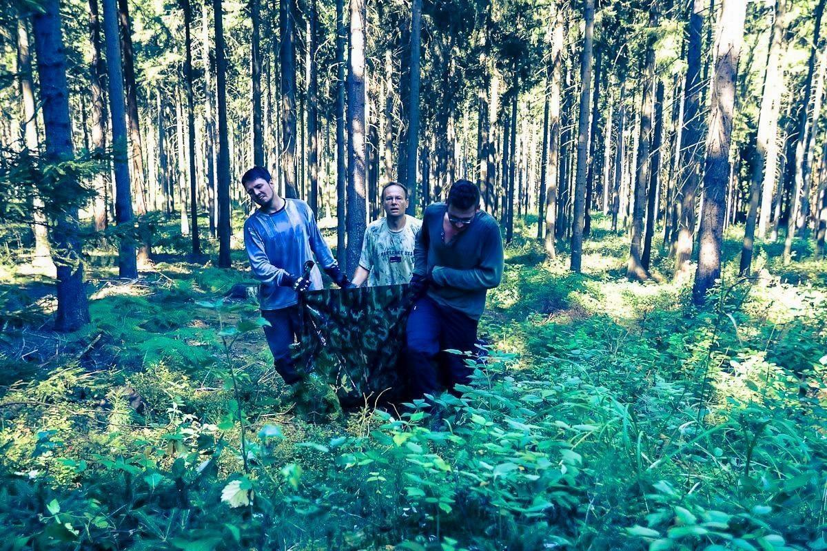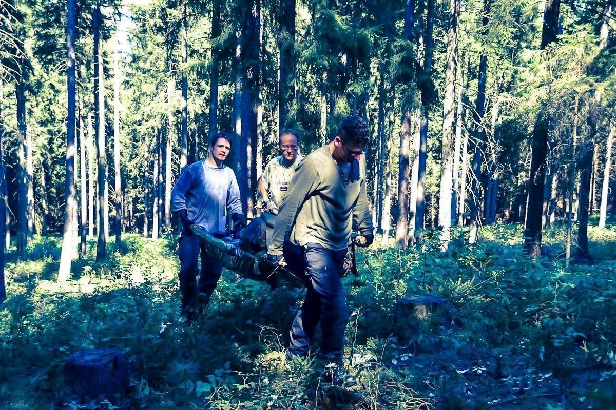 Drei Personen tragen eine improvisierte Trage durch einen Wald mit dichtem Unterholz