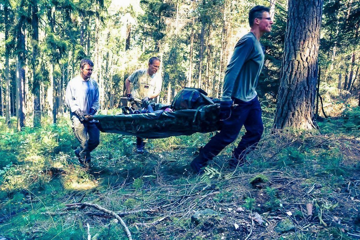 Drei Personen tragen eine improvisierte Trage durch den Wald