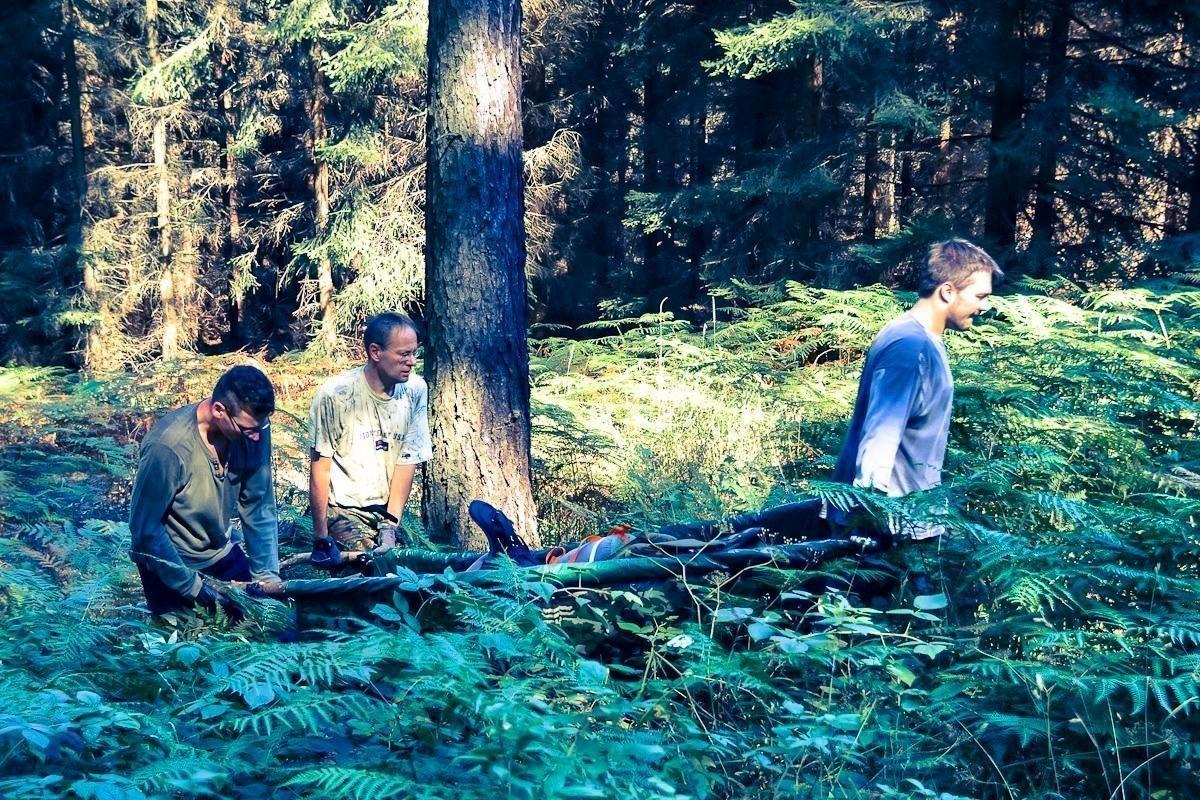 Drei Personen tragen eine improvisierte Trage durch einen Wald