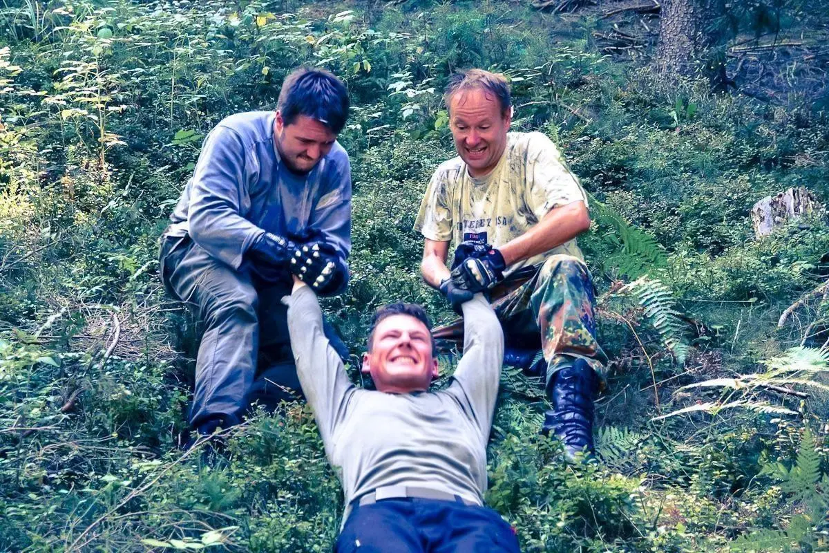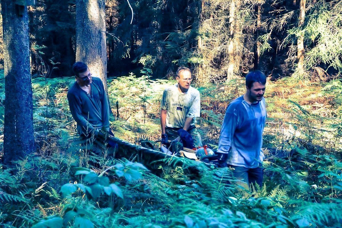 Drei Personen arbeiten gemeinsam an einem Holzstück im Wald