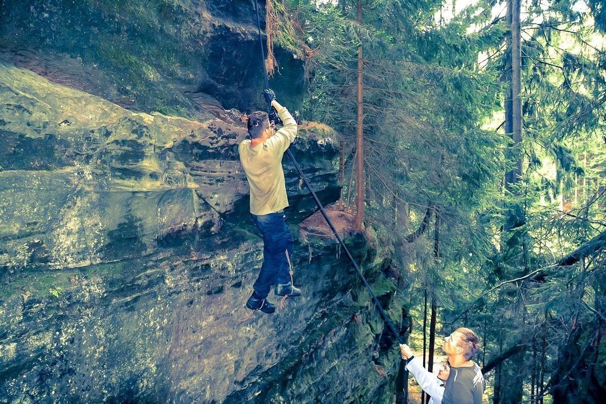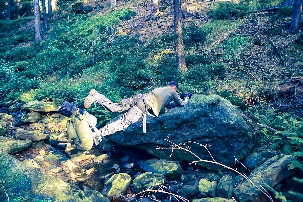 Seilquerung über einen großen Stein in einem bewaldeten Gebiet