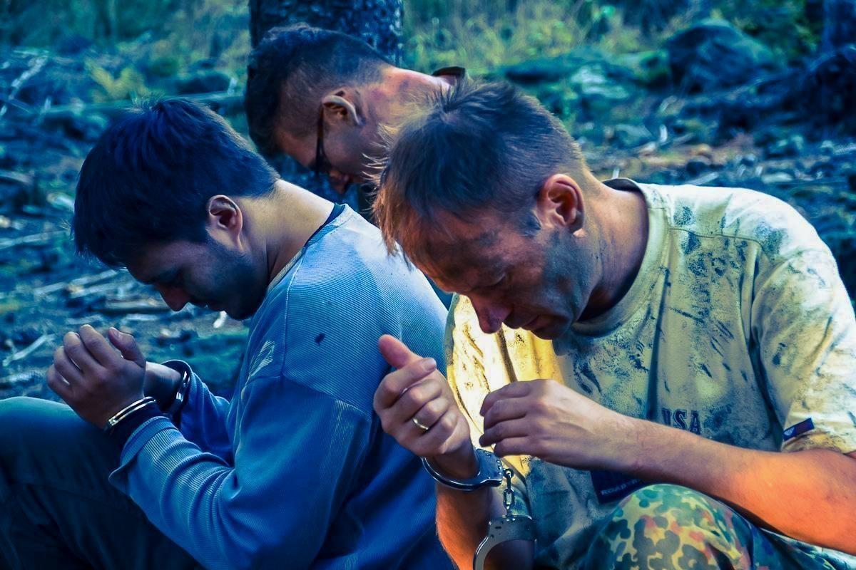 Zwei Personen mit gefesselten Händen knien im Wald auf dem Boden