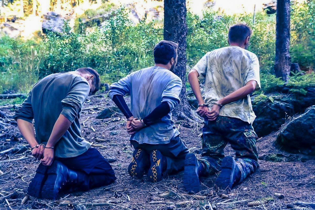 Drei Personen knien mit gefesselten Händen im Wald auf dem Boden