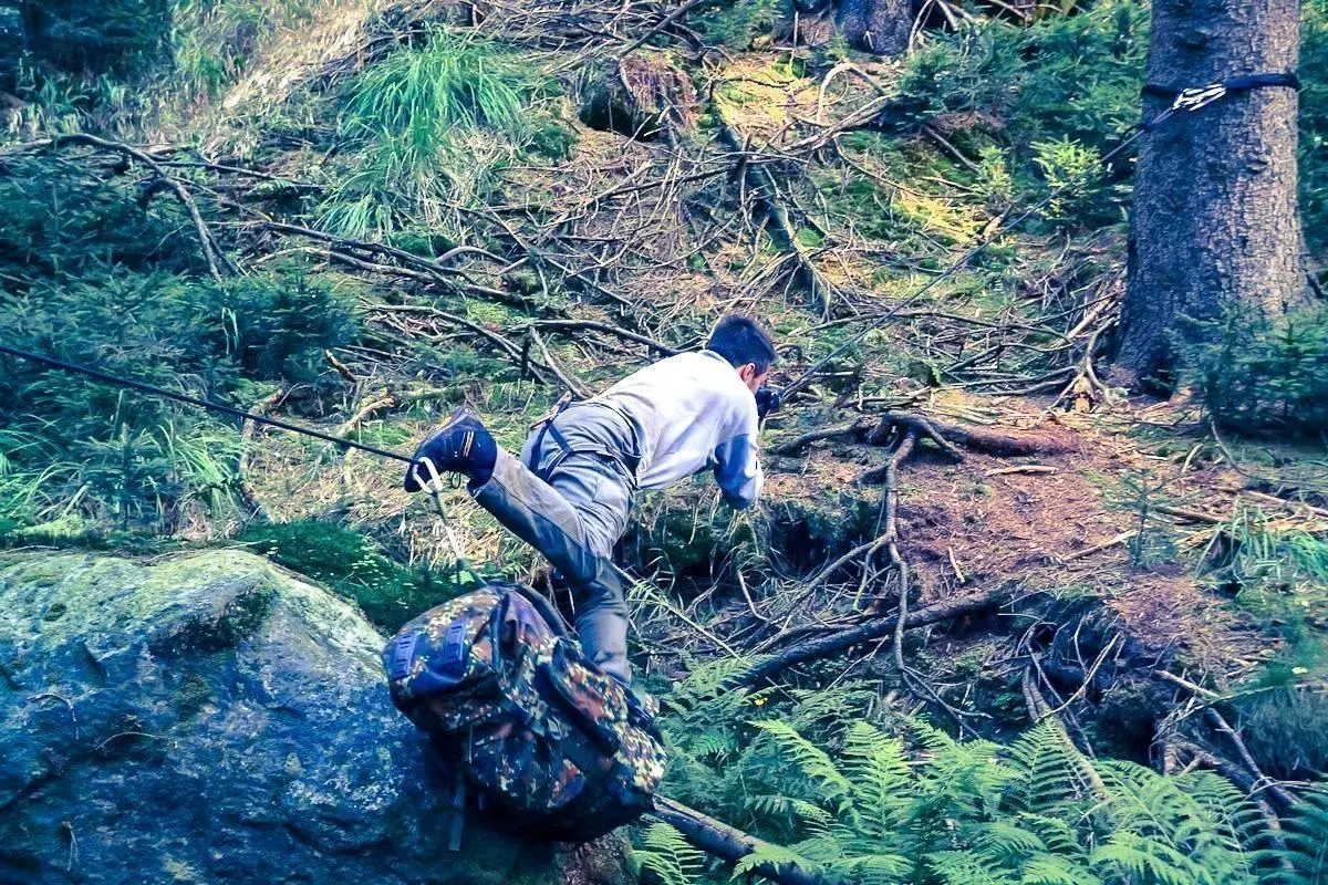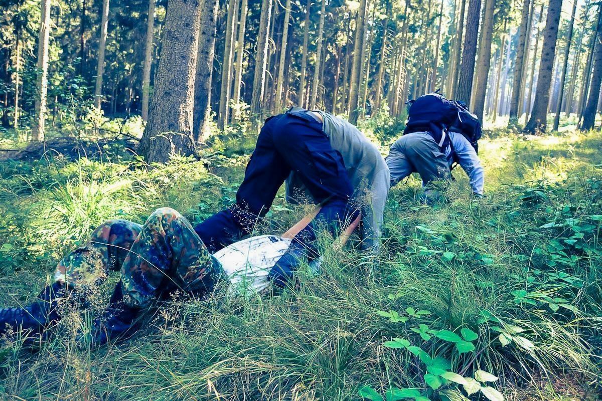Ein weiterer wichtiger Aspekt war die Navigation im Gelände. Die Teilnehmer erlernten Techniken zur Orientierung und zum Tracking, um sich in unbekanntem Terrain zurechtzufinden. In einer praktischen Übung trugen sie schwere Taschen durch den Wald, was ihre Belastbarkeit und Kooperationsfähigkeit auf die Probe stellte. Die Erfahrungen aus diesen Übungen sollten den Teilnehmern helfen, in kritischen Situationen schnell zu reagieren und fundierte Entscheidungen zu treffen.