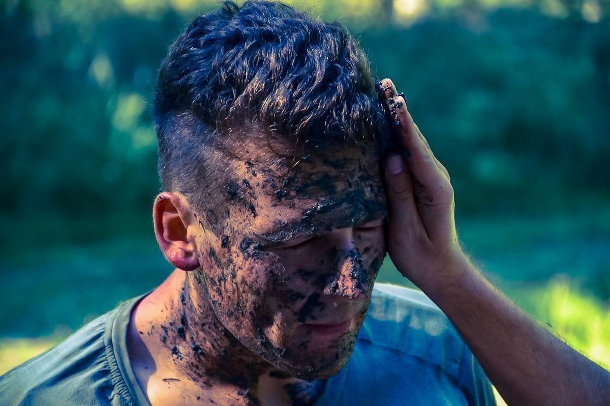 Hände verteilen Schlamm auf dem Gesicht einer Person im Freien