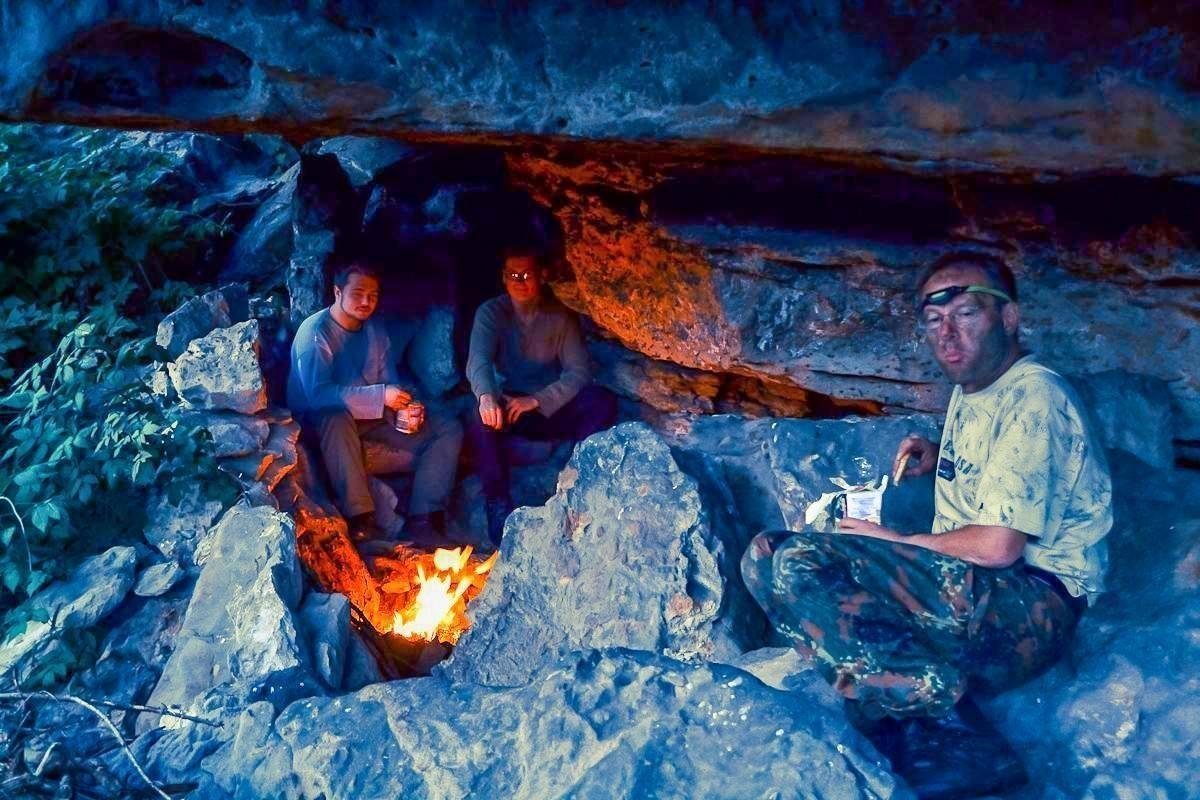 Kleines Bodenfeuer brennt in einer Höhle, drei Personen sitzen um das Feuer