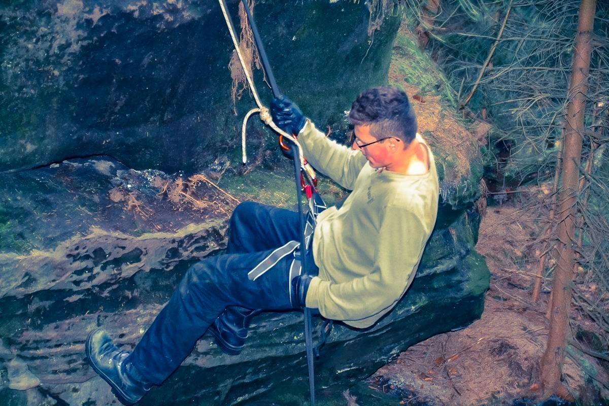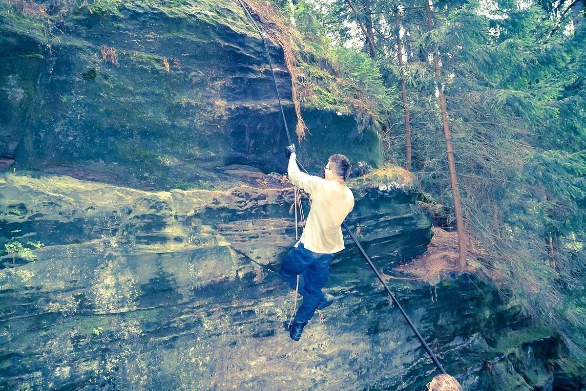 Kletterer sichert sich mit Seil an einer Felswand im Wald