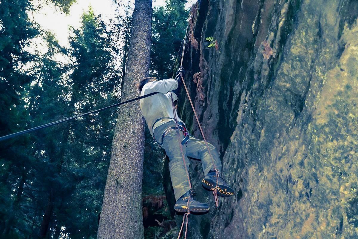Kletterer sichert sich mit Seil an einer Felswand und einem Baum