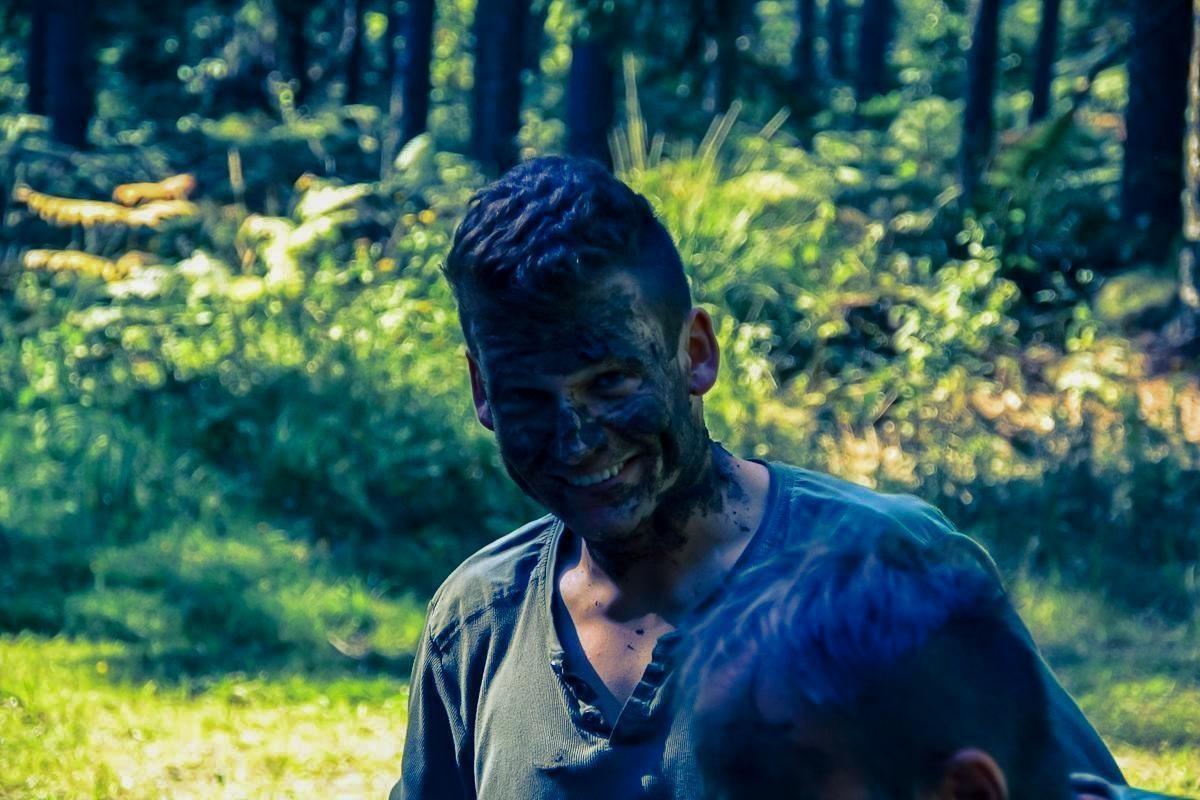 Lächelnder Teilnehmer mit Gesichtsschminke aus Erde in bewaldeter Umgebung