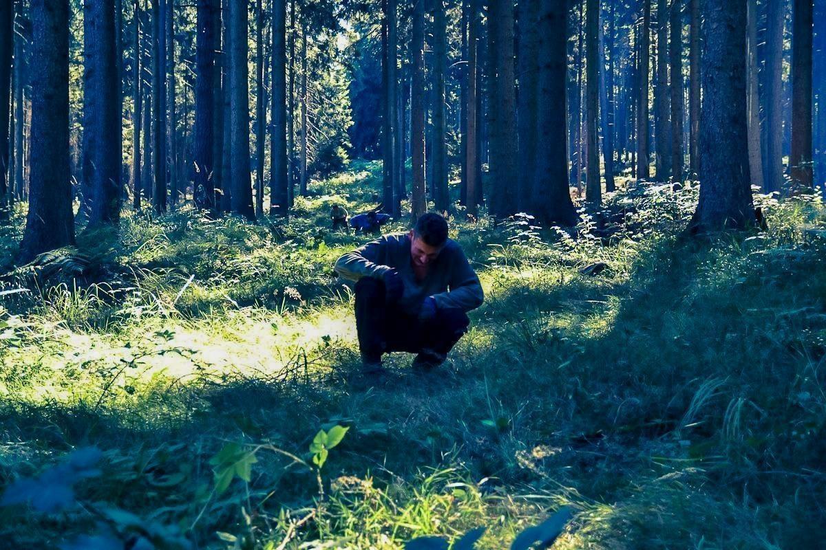 Mann kniet im Wald und untersucht den Boden mit beiden Händen