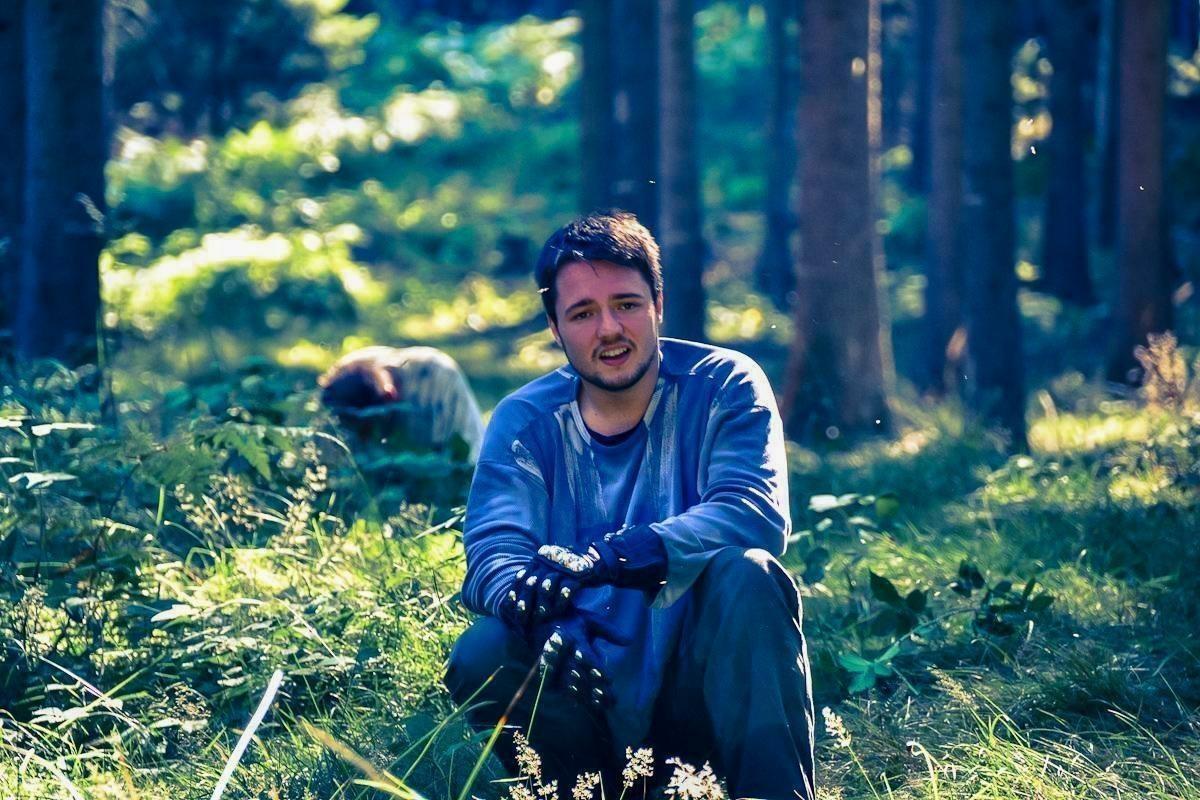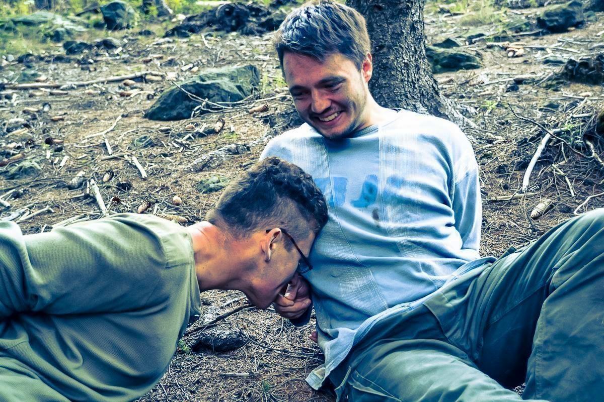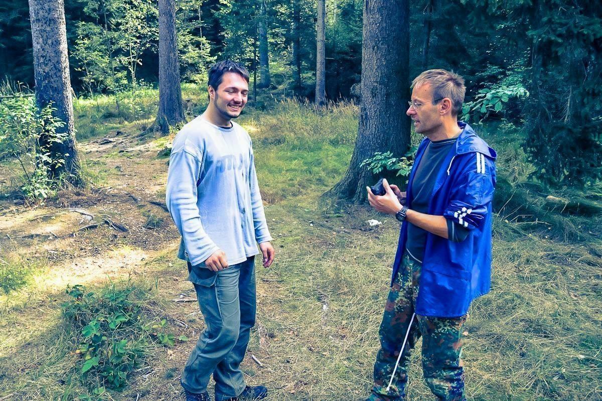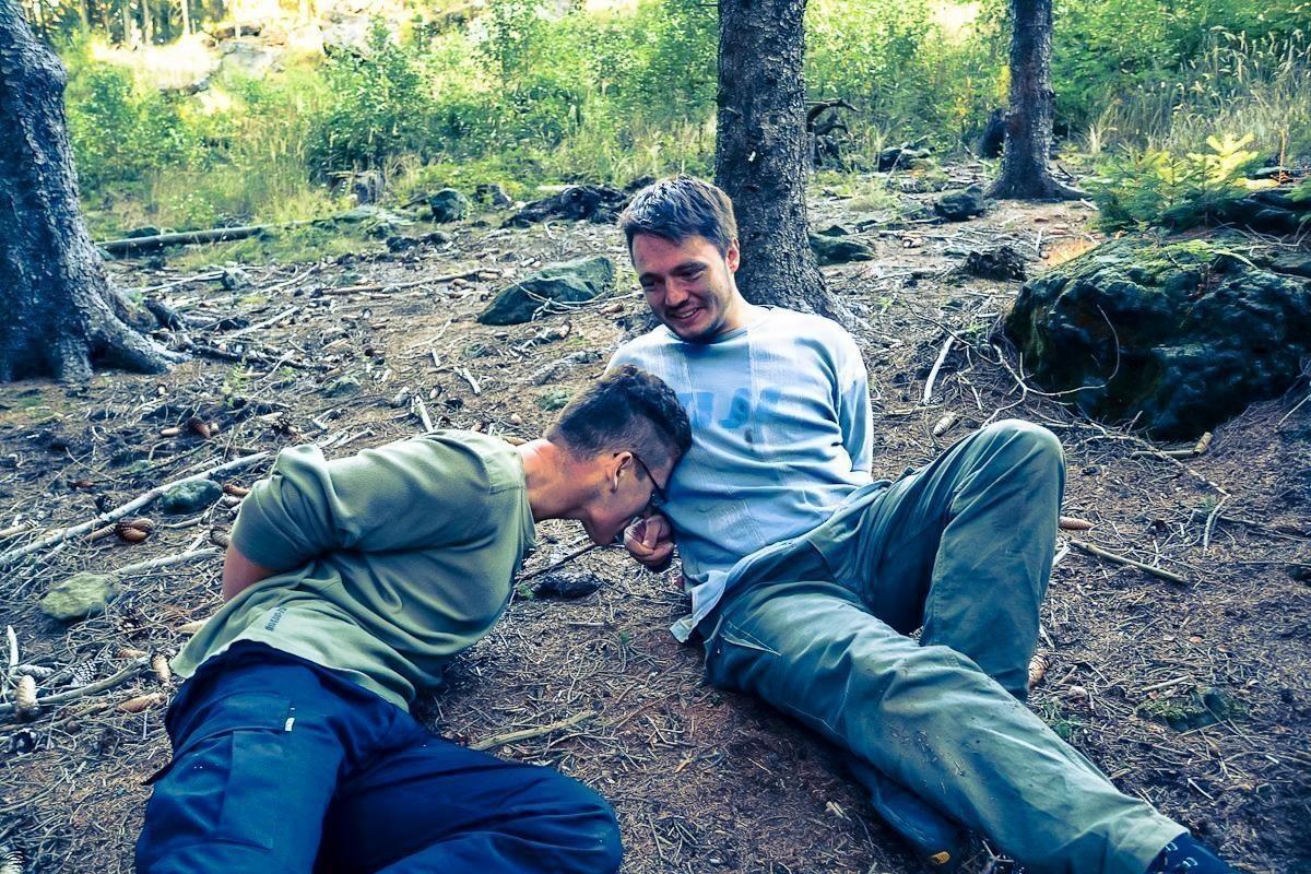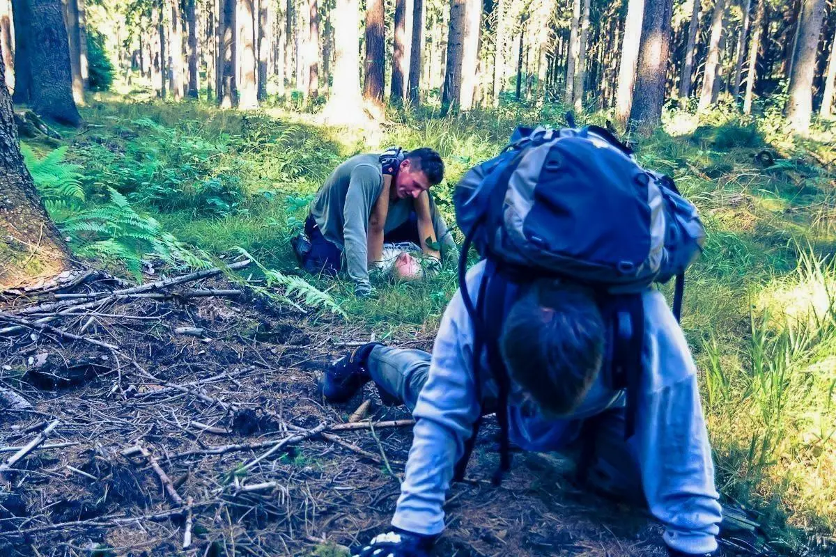 Zwei Personen im Wald, einer zeigt auf eine Verletzung am Arm des anderen