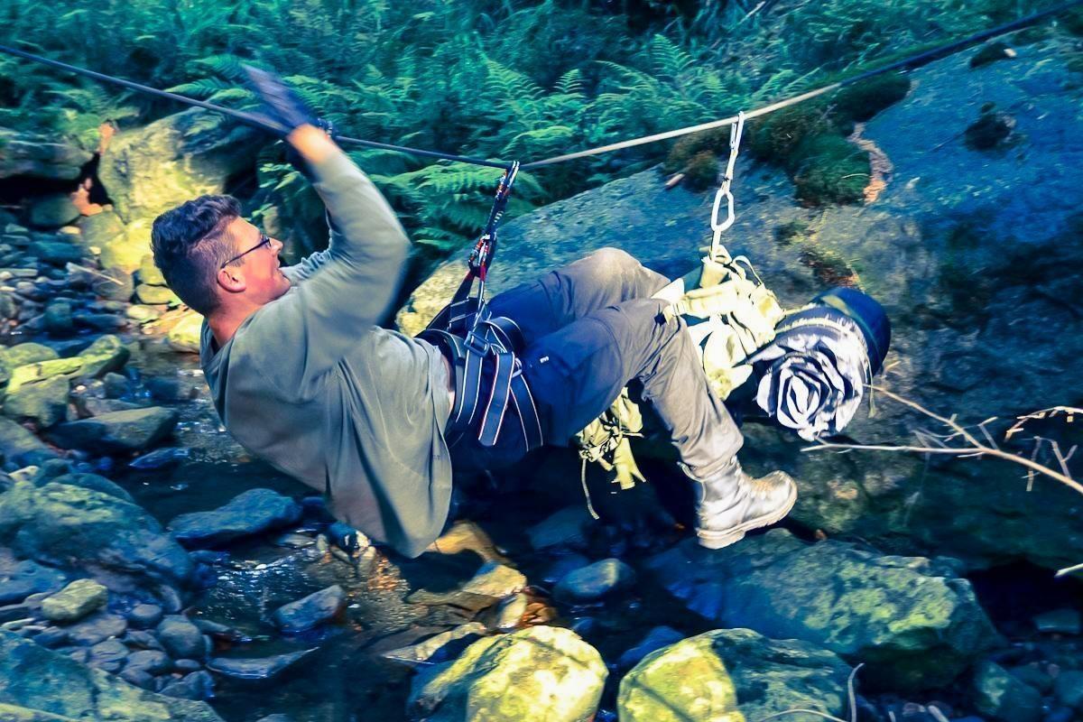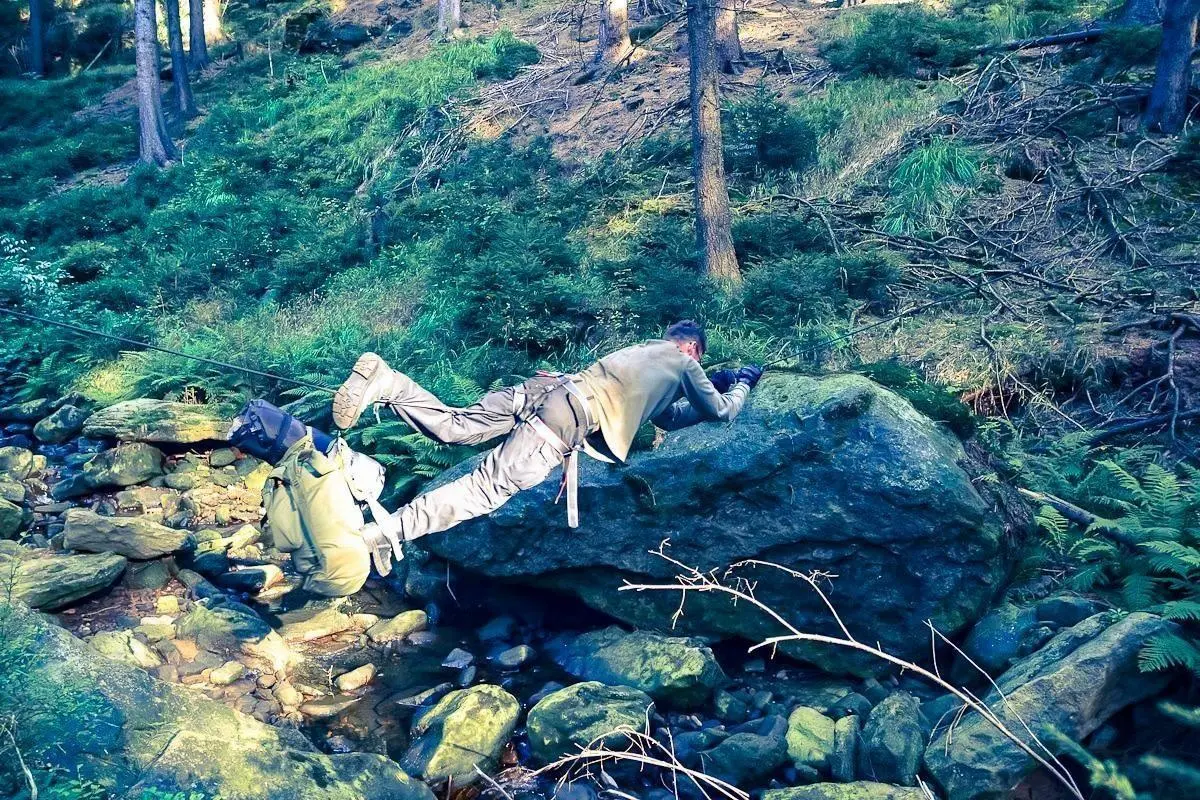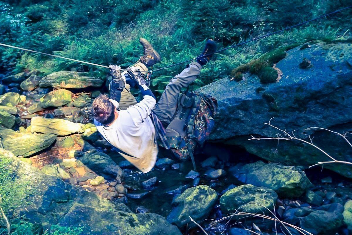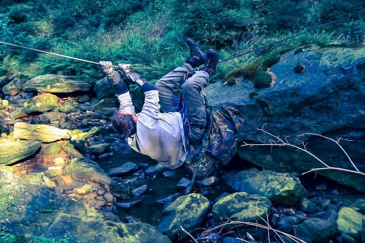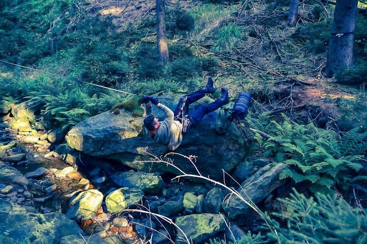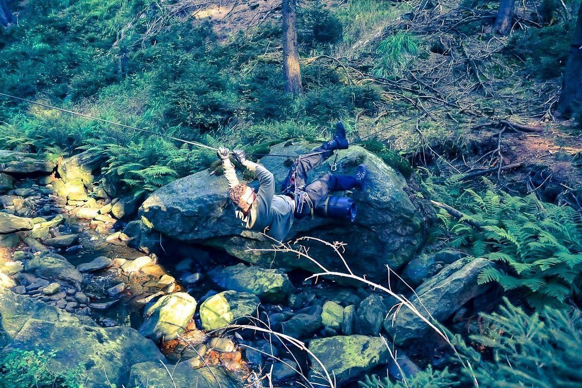 Mann überquert einen Bach an einer selbstgebauten Seilbrücke mit Ausrüstung