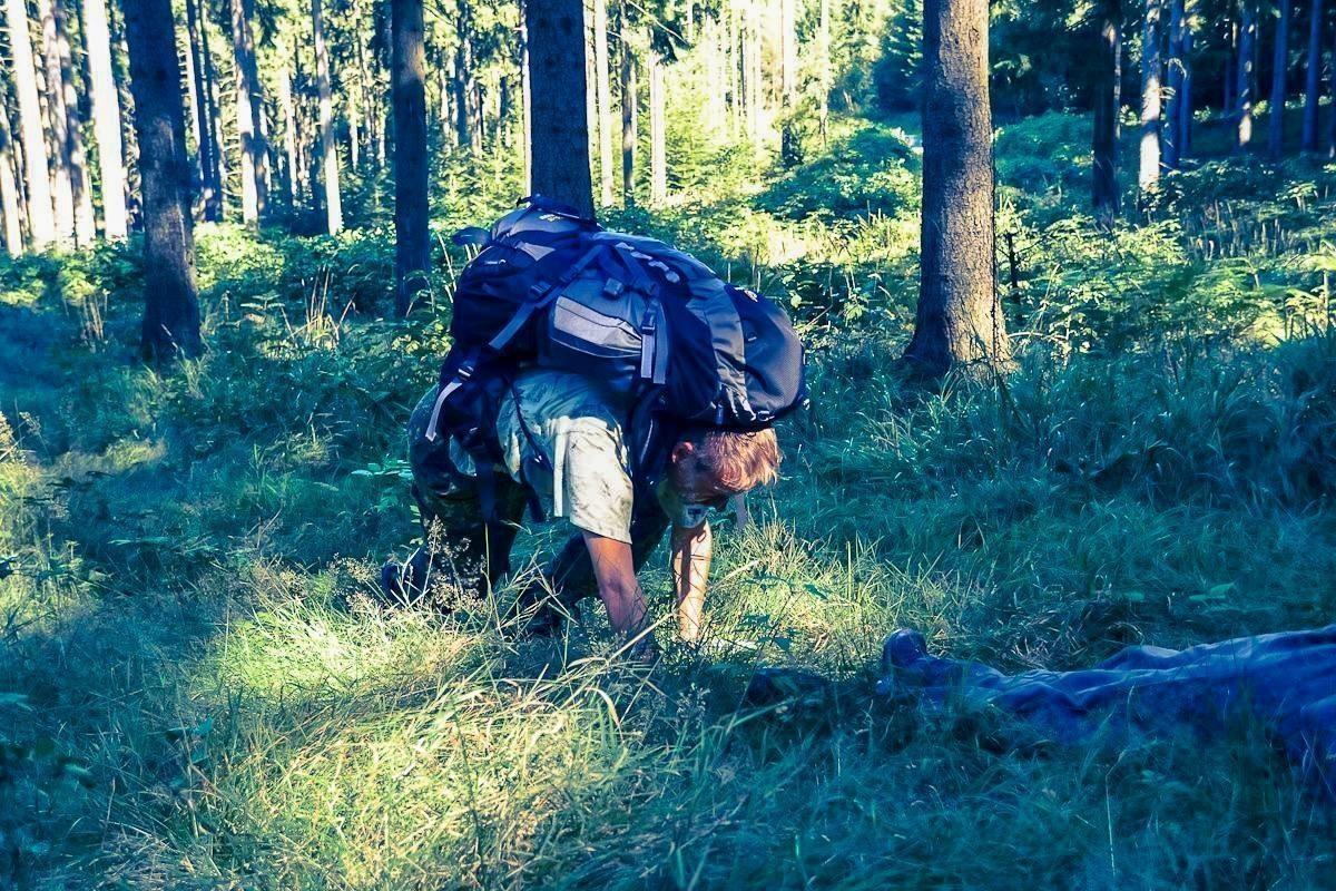 Person krabbelt durch hohes Gras im Wald mit einem großen Rucksack