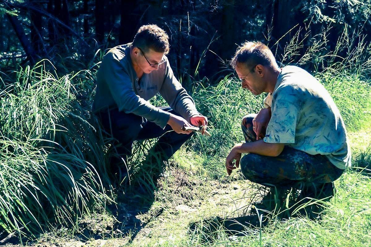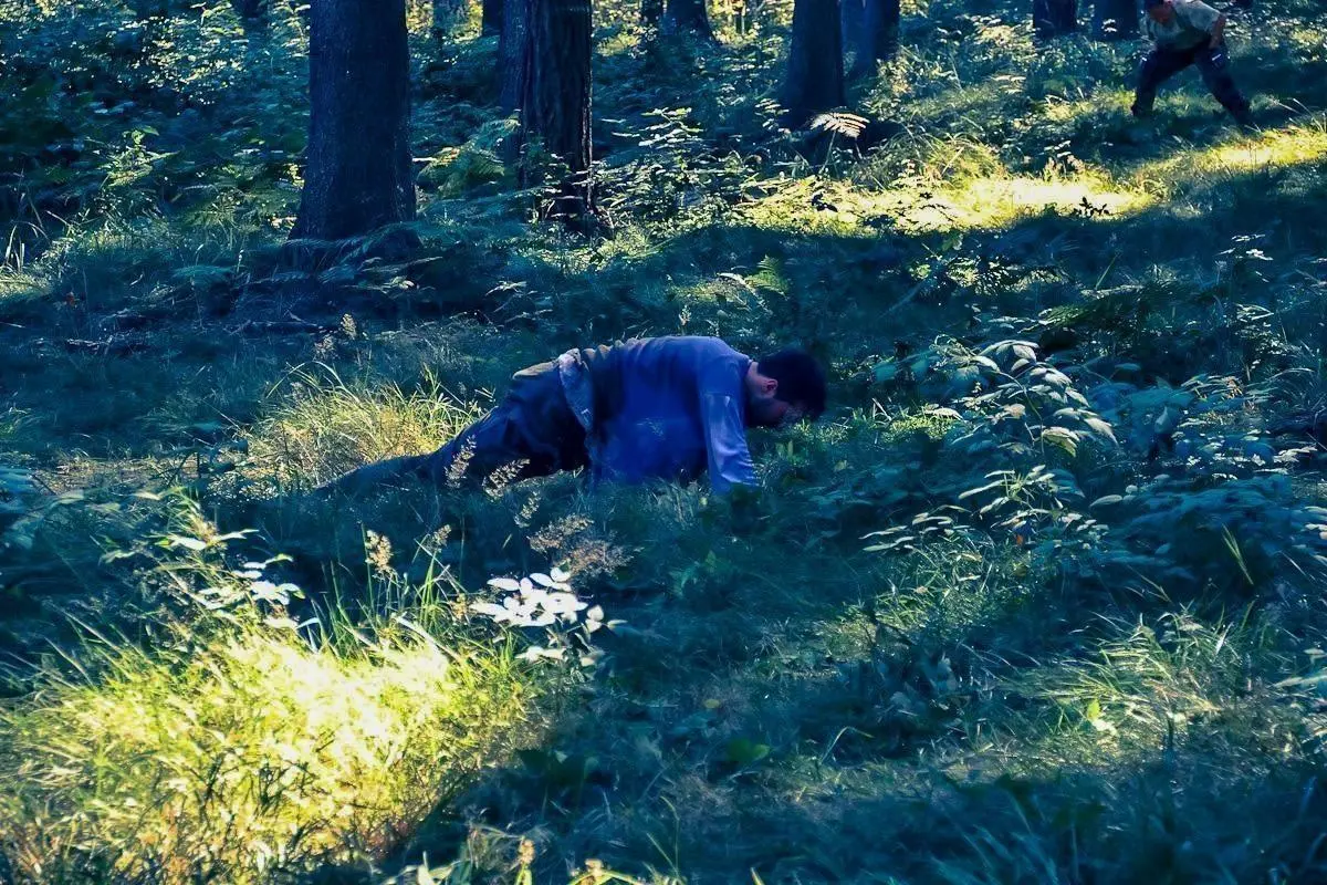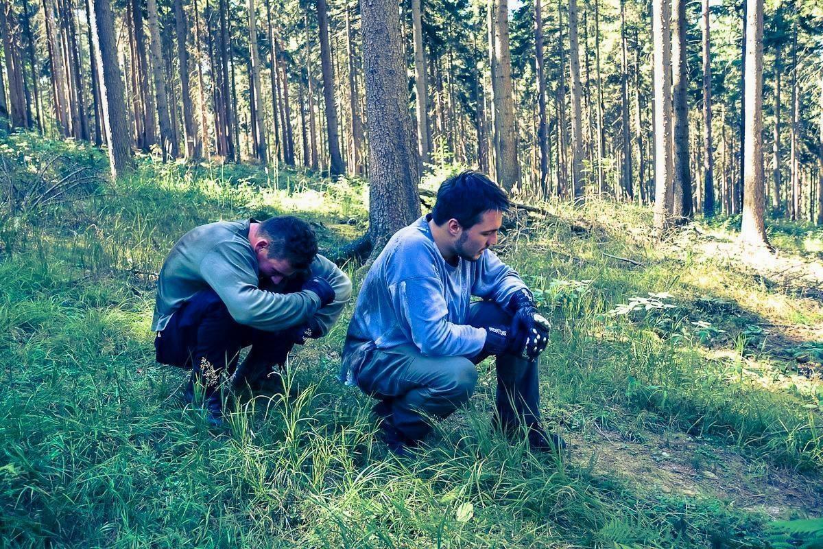 Zwei Personen hocken in einem Waldgebiet auf dem Boden zwischen Bäumen