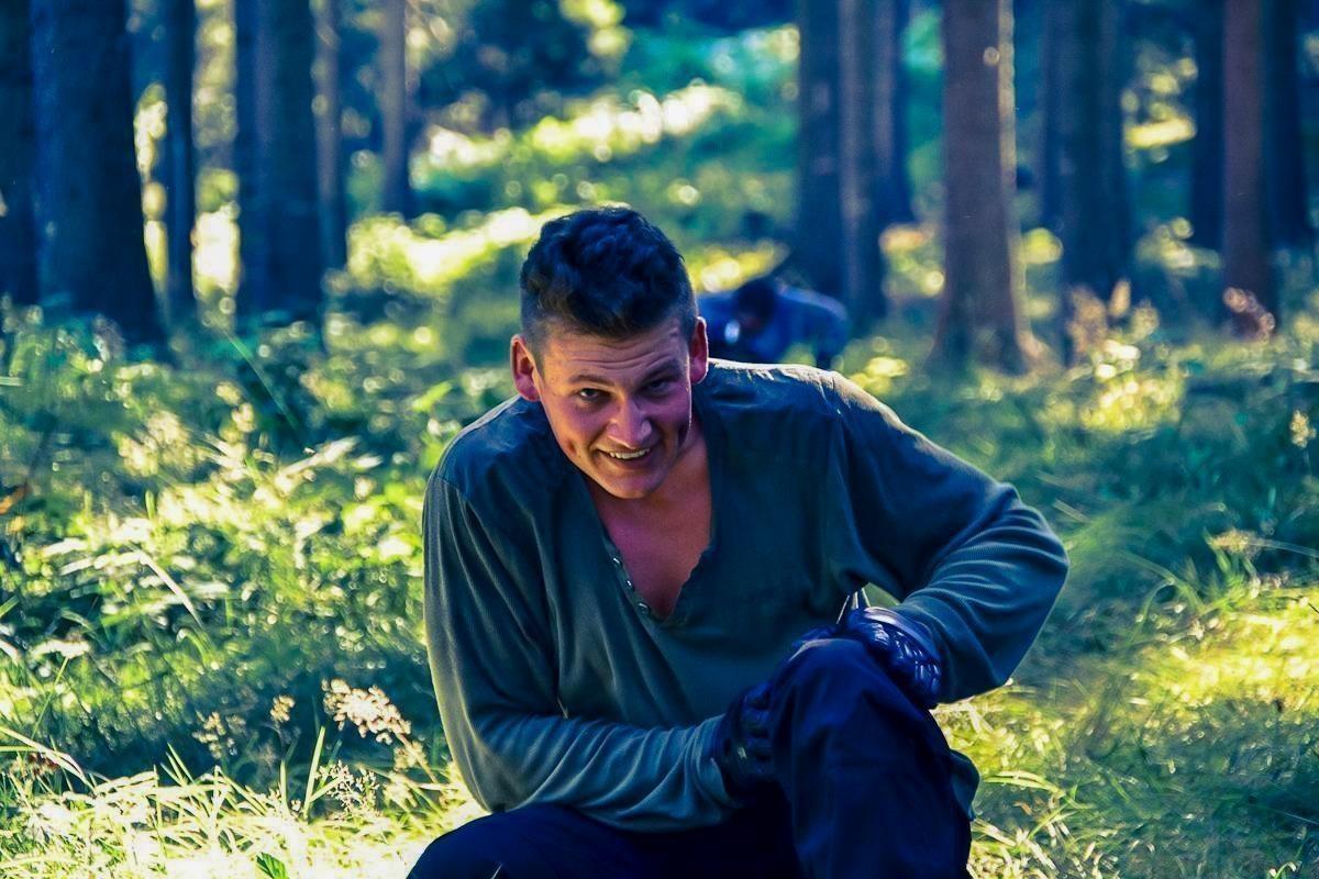 Zwei Personen in einem Wald, eine Person hält eine Waffe, die andere schützt sich