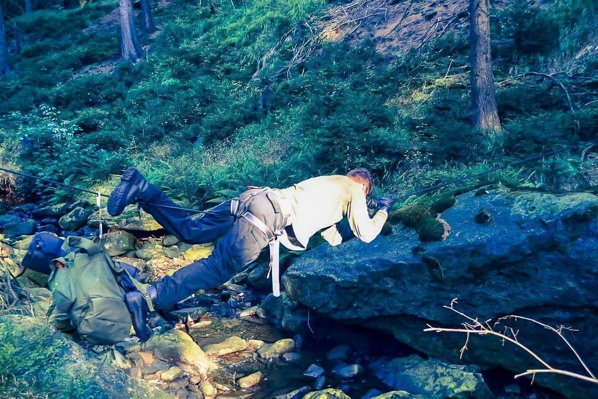 Seilquerung über einen kleinen Bach mit einem selbstgebauten Seil