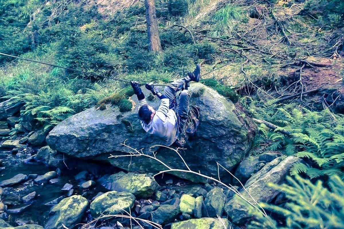 Selbstgebaute Seilquerung über einen Felsen in einem Waldgebiet