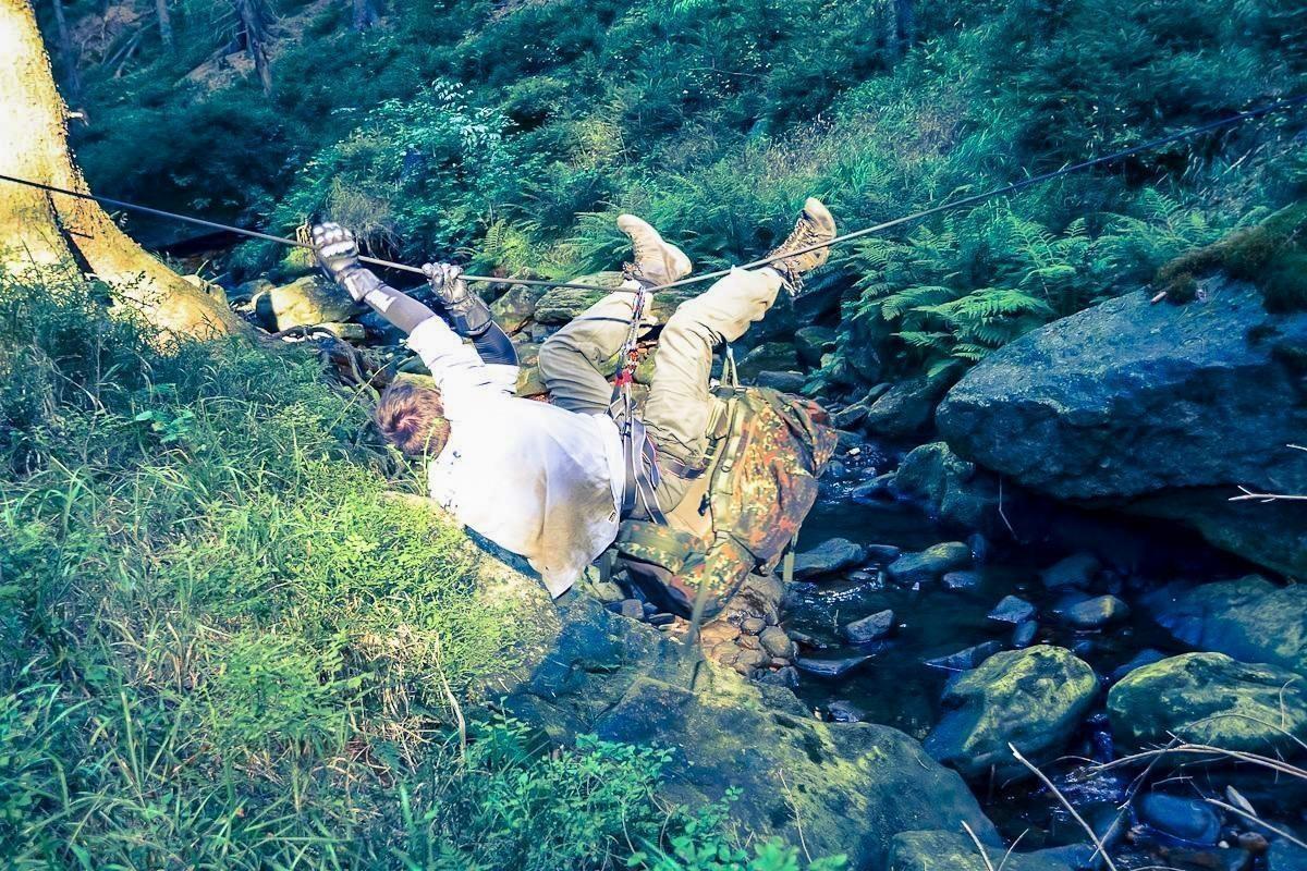 Seilquerung über einen Bach mit selbstgebauter Seilbrücke und Sicherungsgurt