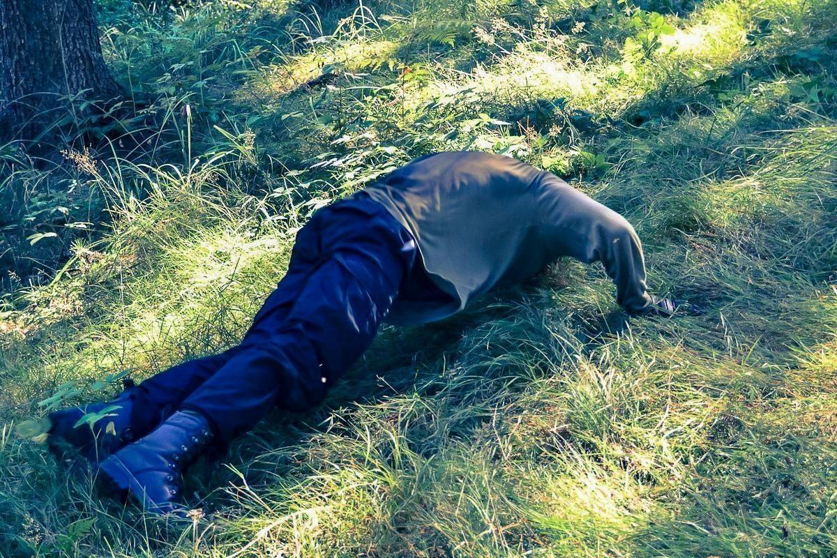 Mann kriecht durch hohes Gras in einem Waldgebiet
