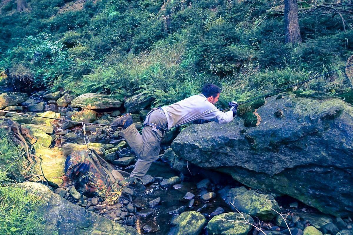 Person überquert einen kleinen Bach im Kriechgang, Ausrüstung liegt am Ufer